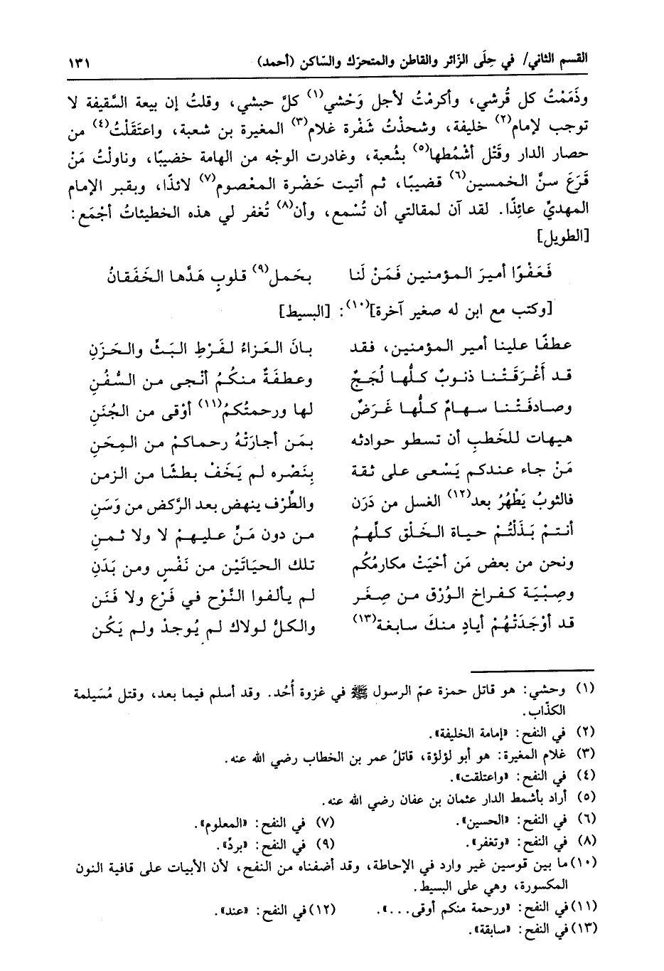 وذممت كل قرشي، وأكرمت لأجل وحشي «1» كلّ حبشي، وقلت إن بيعة السّقيفة لا توجب لإمام «2» خليفة، وشحذت شفرة غلام «3» المغيرة بن شعبة، واعتقلت «4» من حصار الدار وقتل أشمطها «5» بشعبة، وغادرت الوجه من الهامة خضيبا، وناولت من قرع سنّ الخمسين «6» قضيبا، ثم أتيت حضرة المعصوم «7» لائذا، وبقبر الإمام المهديّ عائذا. لقد آن لمقالتي أن تسمع، وأن «8» تغفر لي هذه الخطيئات أجمع: