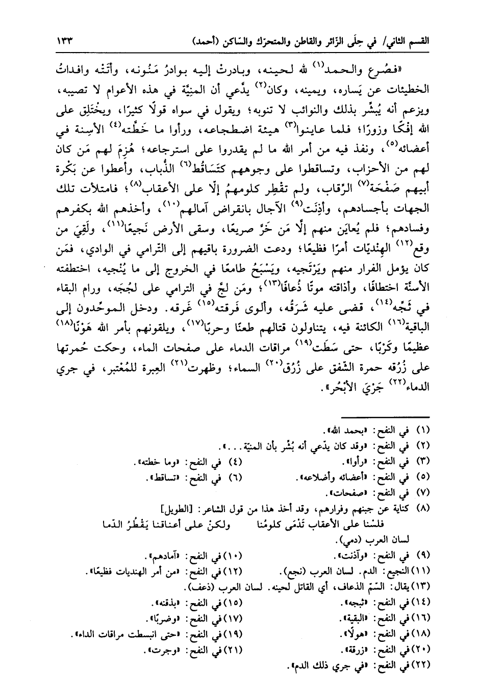 «فصرع والحمد «1» لله لحينه، وبادرت إليه بوادر منونه، وأتته وافدات الخطيئات عن يساره، ويمينه، وكان «2» يدّعي أن المنيّة في هذه الأعوام لا تصيبه، ويزعم أنه يبشّر بذلك والنوائب لا تنوبه؛ ويقول في سواه قولا كثيرا، ويختلق على الله إفكا وزورا؛ فلما عاينوا «3» هيئة اضطجاعه، ورأوا ما خطّته «4» الأسنة في أعضائه «5» ، ونفذ فيه من أمر الله ما لم يقدروا على استرجاعه؛ هزم لهم من كان لهم من الأحزاب، وتساقطوا على وجوههم كتساقط «6» الذّباب، وأعطوا عن بكرة أبيهم صفحة «7» الرّقاب، ولم تقطر كلومهم إلّا على الأعقاب «8» ؛ فامتلأت تلك الجهات بأجسادهم، وأذنت «9» الآجال بانقراض آمالهم «10» ، وأخذهم الله بكفرهم وفسادهم؛ فلم يعاين منهم إلّا من خرّ صريعا، وسقى الأرض نجيعا «11» ، ولقي من وقع «12» الهنديّات أمرا فظيعا؛ ودعت الضرورة باقيهم إلى التّرامي في الوادي، فمن كان يؤمل الفرار منهم ويرتجيه، ويسبح طامعا في الخروج إلى ما ينجيه، اختطفته الأسنّة اختطافا، وأذاقته موتا ذعافا «13» ؛ ومن لجّ في الترامي على لججه، ورام البقاء في ثجّه «14» ، قضى عليه شرقه، وألوى فرقته «15» غرقه. ودخل الموحّدون إلى الباقية «16» الكائنة فيه، يتناولون قتالهم طعنا وحربا «17» ، ويلقونهم بأمر الله هونا «18» عظيما وكربا، حتى سطت «19» مراقات الدماء على صفحات الماء، وحكت حمرتها على زرقه حمرة الشّفق على زرق «20» السماء؛ وظهرت «21» العبرة للمعتبر، في جري الدماء «22» جري الأبحر» .