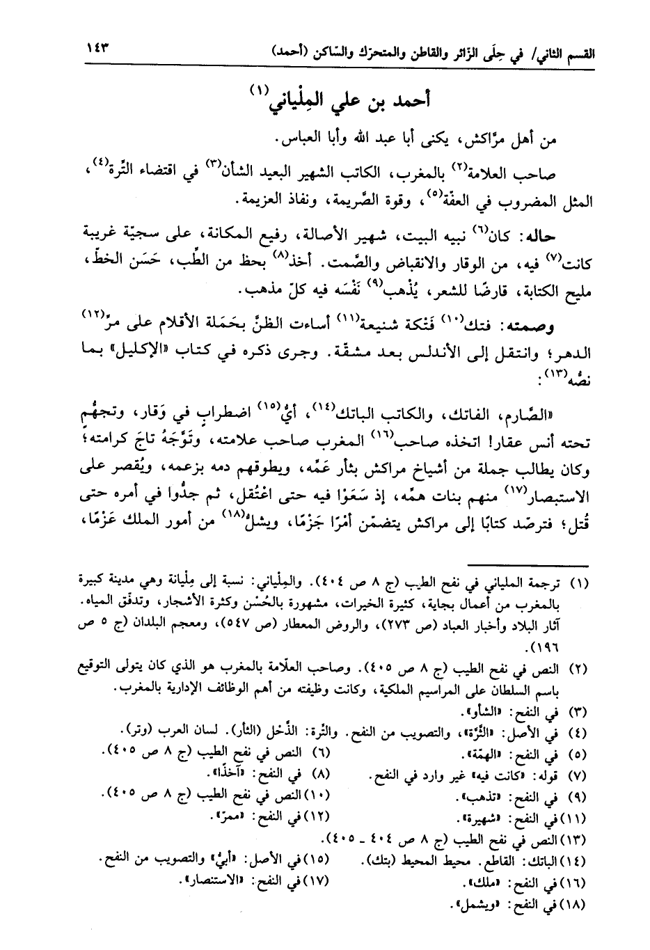 صاحب العلامة «2» بالمغرب، الكاتب الشهير البعيد الشأن «3» في اقتضاء التّرة «4» ، المثل المضروب في العفّة «5» ، وقوة الصّريمة، ونفاذ العزيمة.