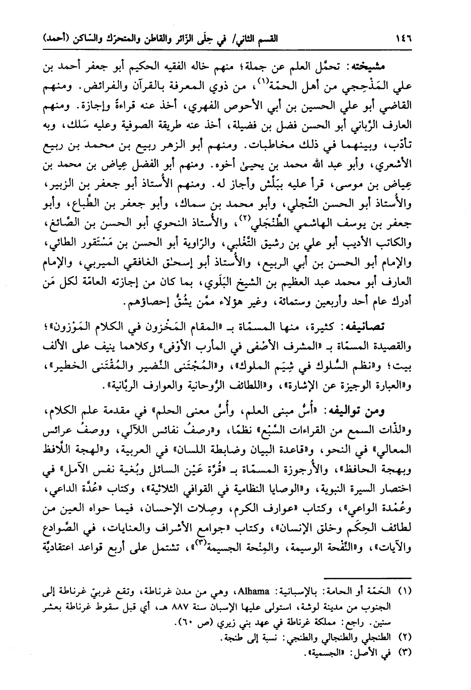 مشيخته: تحمّل العلم عن جملة؛ منهم خاله الفقيه الحكيم أبو جعفر أحمد بن علي المذحجي من أهل الحمّة «1» ، من ذوي المعرفة بالقرآن والفرائض. ومنهم القاضي أبو علي الحسين بن أبي الأحوص الفهري، أخذ عنه قراءة وإجازة. ومنهم العارف الرّباني أبو الحسن فضل بن فضيلة، أخذ عنه طريقة الصوفية وعليه سلك، وبه تأدّب، وبينهما في ذلك مخاطبات. ومنهم أبو الزهر ربيع بن محمد بن ربيع الأشعري، وأبو عبد الله محمد بن يحيى أخوه. ومنهم أبو الفضل عياض بن محمد بن عياض بن موسى، قرأ عليه ببلّش وأجاز له. ومنهم الأستاذ أبو جعفر بن الزبير، والأستاذ أبو الحسن التّجلي، وأبو محمد بن سماك، وأبو جعفر بن الطّباع، وأبو جعفر بن يوسف الهاشمي الطّنجلي «2» ، والأستاذ النحوي أبو الحسن بن الصّائغ، والكاتب الأديب أبو علي بن رشيق التّغلبي، والرّاوية أبو الحسن بن مستقور الطائي، والإمام أبو الحسن بن أبي الربيع، والأستاذ أبو إسحاق الغافقي الميربي، والإمام العارف أبو محمد عبد العظيم بن الشيخ البلوي، بما كان من إجازته العامّة لكل من أدرك عام أحد وأربعين وستمائة، وغير هؤلاء ممّن يشقّ إحصاؤهم.