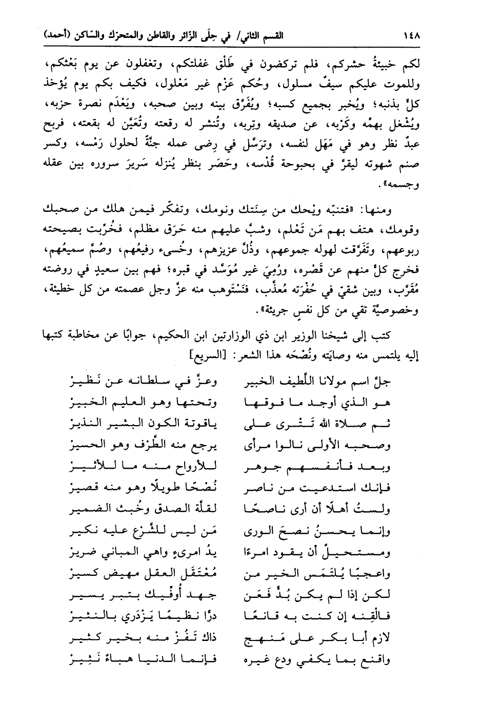 كتب إلى شيخنا الوزير ابن ذي الوزارتين ابن الحكيم، جوابا عن مخاطبة كتبها إليه يلتمس منه وصايته ونصحه هذا الشعر: [السريع]