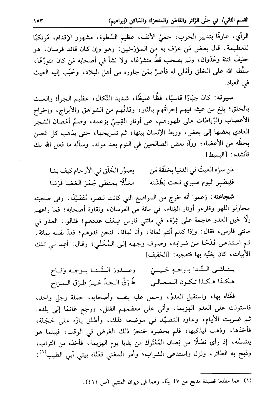 ثم ضربت الأيام، وعاود التصيّد في موضعه ذلك، وأطلق بازه على حجلة، فأخذها، وذهب ليذكيها، فلم يحضره خنجر ذلك الغرض في الوقت، فبينما هو يلتمسه، إذ رأى نصلا من نصال المعترك من بقايا يوم الهزيمة، فأخذه من التراب، وذبح به الطائر، ونزل واستدعى الشراب؛ وأمر المغني فغنّاه بيتي أبي الطيب «1» :
