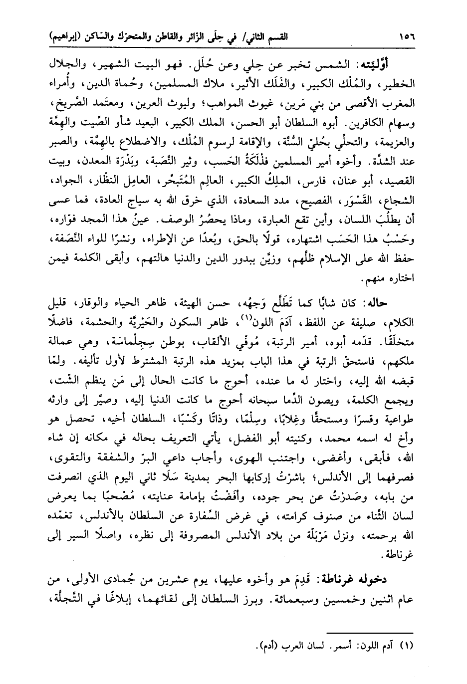 أوّليّته: الشمس تخبر عن حلي وعن حلل. فهو البيت الشهير، والجلال الخطير، والملك الكبير، والفلك الأثير، ملاك المسلمين، وحماة الدين، وأمراء المغرب الأقصى من بني مرين، غيوث المواهب؛ وليوث العرين، ومعتمد الصّريخ، وسهام الكافرين. أبوه السلطان أبو الحسن، الملك الكبير، البعيد شأو الصّيت والهمّة والعزيمة، والتحلّي بحليّ السّنّة، والإقامة لرسوم الملك، والاضطلاع بالهمّة، والصبر عند الشدّة. وأخوه أمير المسلمين فذلكة الحسب، وثير النّصبة، وبدرة المعدن، وبيت القصيد، أبو عنان، فارس، الملك الكبير، العالم المتبحّر، العامل النظّار، الجواد، الشجاع، القسور، الفصيح، مدد السعادة، الذي خرق الله به سياج العادة، فما عسى أن يطلب اللسان، وأين تقع العبارة، وماذا يحصر الوصف. عين هذا المجد فوّاره، وحسب هذا الحسب اشتهاره، قولا بالحق، وبعدا عن الإطراء، ونشرا للواء النّصفة، حفظ الله على الإسلام ظلّهم، وزيّن ببدور الدين والدنيا هالتهم، وأبقى الكلمة فيمن اختاره منهم.