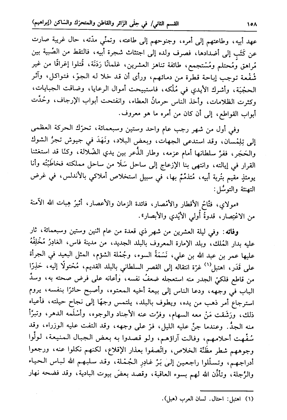 وفي أول من شهر رجب عام واحد وستين وسبعمائة، تحرّك الحركة العظمى إلى تلمسان، وقد استدعى الجهات، وبعض البلاد، ونهد في جيوش تجرّ الشوك والحجر، ففرّ سلطانها أمام عزمه، وطار الذّعر بين يدي الضّلالة، وكنّا قد استغثنا القرار في إيالته، وانتهى بنا الإزعاج إلى ساحل سلا من ساحل مملكته فخاطبته وأنا يومئذ مقيم بتربة أبيه، متذمّم بها، في سبيل استخلاص أملاكي بالأندلس، في غرض التهنئة والتوسّل:
