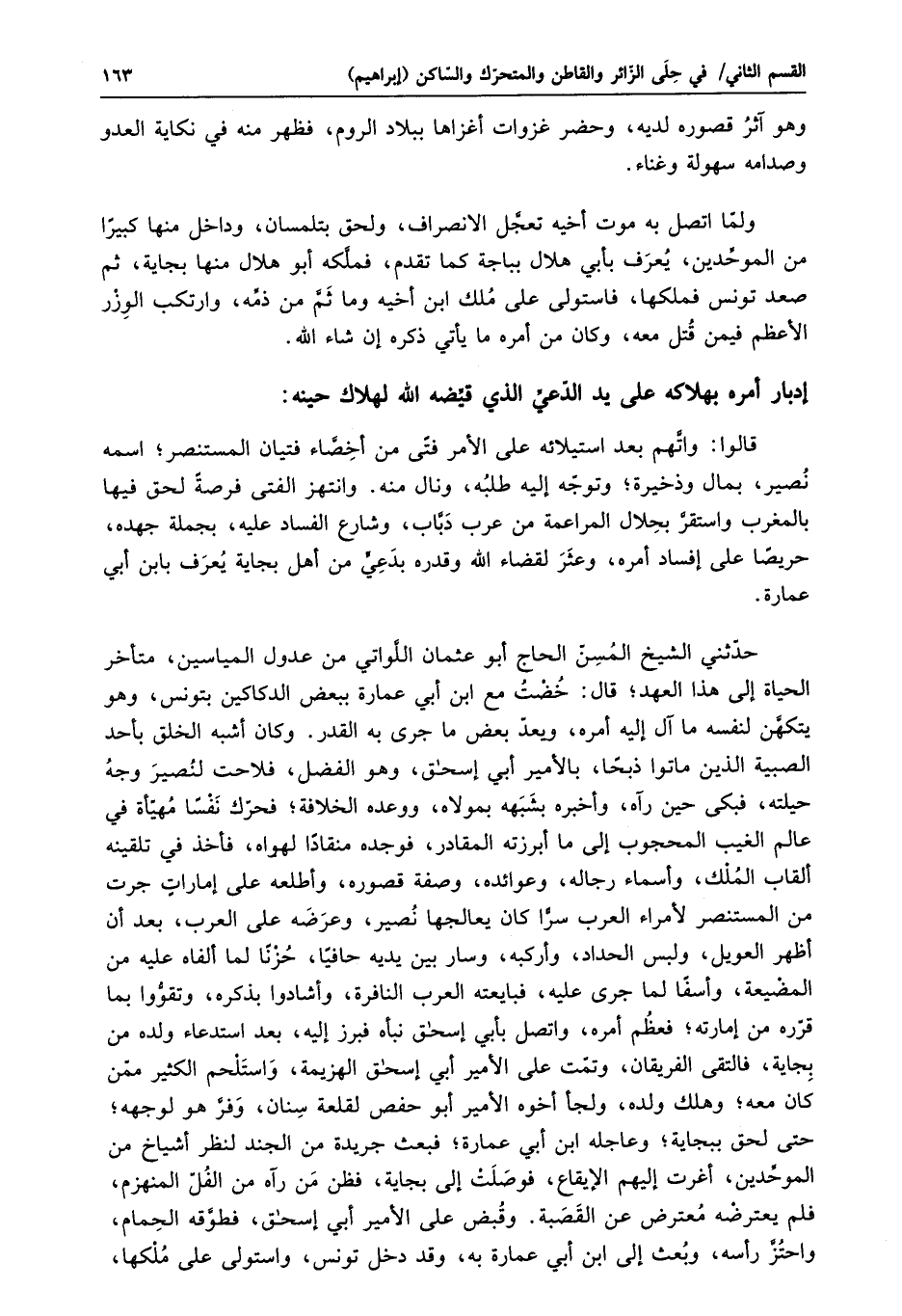 حدّثني الشيخ المسنّ الحاج أبو عثمان اللّواتي من عدول المياسين، متأخر الحياة إلى هذا العهد؛ قال: خضت مع ابن أبي عمارة ببعض الدكاكين بتونس، وهو يتكهّن لنفسه ما آل إليه أمره، ويعدّ بعض ما جرى به القدر. وكان أشبه الخلق بأحد الصبية الذين ماتوا ذبحا، بالأمير أبي إسحاق، وهو الفضل، فلاحت لنصير وجه حيلته، فبكى حين رآه، وأخبره بشبهه بمولاه، ووعده الخلافة؛ فحرّك نفسا مهيّأة في عالم الغيب المحجوب إلى ما أبرزته المقادر، فوجده منقادا لهواه، فأخذ في تلقينه ألقاب الملك، وأسماء رجاله، وعوائده، وصفة قصوره، وأطلعه على إمارات جرت من المستنصر لأمراء العرب سرّا كان يعالجها نصير، وعرضه على العرب، بعد أن أظهر العويل، ولبس الحداد، وأركبه، وسار بين يديه حافيا، حزنا لما ألفاه عليه من المضيعة، وأسفا لما جرى عليه، فبايعته العرب النافرة، وأشادوا بذكره، وتقوّوا بما قرّره من إمارته؛ فعظم أمره، واتصل بأبي إسحاق نبأه فبرز إليه، بعد استدعاء ولده من بجاية، فالتقى الفريقان، وتمّت على الأمير أبي إسحاق الهزيمة، واستلحم الكثير ممّن كان معه؛ وهلك ولده، ولجأ أخوه الأمير أبو حفص لقلعة سنان، وفرّ هو لوجهه؛ حتى لحق ببجاية؛ وعاجله ابن أبي عمارة؛ فبعث جريدة من الجند لنظر أشياخ من الموحّدين، أغرت إليهم الإيقاع، فوصلت إلى بجاية، فظن من رآه من الفلّ المنهزم، فلم يعترضه معترض عن القصبة. وقبض على الأمير أبي إسحاق، فطوّقه الحمام، واحتزّ رأسه، وبعث إلى ابن أبي عمارة به، وقد دخل تونس، واستولى على ملكها،