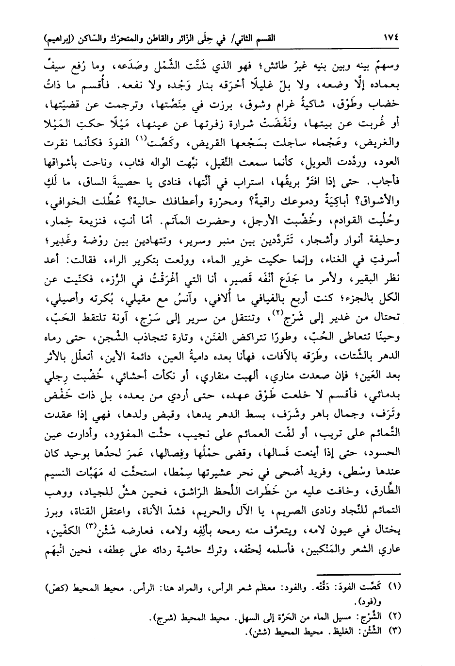 وسهم بينه وبين بنيه غير طائش؛ فهو الذي شتّت الشّمل وصدعه، وما رفع سيف بعماده إلّا وضعه، ولا بلّ غليلا أحرقه بنار وجده ولا نفعه. فأقسم ما ذات خضاب وطوق، شاكية غرام وشوق، برزت في منصّتها، وترجمت عن قضيّتها، أو غربت عن بيتها، ونفضت شرارة زفرتها عن عينها، ميلا حكت الميلا والغريض، وعجماء ساجلت بسجعها القريض، وكصّت «1» الفود فكأنما نقرت العود، وردّدت العويل، كأنما سمعت النّقيل، نبّهت الواله فثاب، وناحت بأشواقها فأجاب. حتى إذا افترّ بريقها، استراب في أنّتها، فنادى يا حصيبة الساق، ما لك والأشواق؟ أباكية ودموعك راقية؟ ومحرّرة وأعطافك حالية؟ عطّلت الخوافي، وحلّيت القوادم، وخضّبت الأرجل، وحضرت المآتم. أمّا أنت، فنزيعة خمار، وحليفة أنوار وأشجار، تتردّدين بين منبر وسرير، وتتهادين بين روضة وغدير؛ أسرفت في الغناء، وإنما حكيت خرير الماء، وولعت بتكرير الراء، فقالت: أعد نظر البقير، ولأمر ما جدع أنفه قصير، أنا التي أغرقت في الرّزء، فكنّيت عن الكل بالجزء؛ كنت أربع بالفيافي ما ألافي، وآنس مع مقيلي، بكرته وأصيلي، تحتال من غدير إلى شرج «2» ، وتنتقل من سرير إلى سرج، آونة تلتقط الحبّ، وحينا تتعاطى الحبّ، وطورا تتراكض الفنن، وتارة تتجاذب الشّجن، حتى رماه الدهر بالشّتات، وطرقه بالآفات، فهأنا بعده دامية العين، دائمة الأين، أتعلّل بالأثر بعد العين؛ فإن صعدت مناري، ألهبت منقاري، أو نكأت أحشائي، خضّبت رجلي بدمائي، فأقسم لا خلعت طوق عهده، حتى أردي من بعده، بل ذات خفض وترف، وجمال باهر وشرف، بسط الدهر يدها، وقبض ولدها، فهي إذا عقدت التّمائم على تريب، أو لفّت العمائم على نجيب، حثّت المفؤود، وأدارت عين الحسود، حتى إذا أينعت فسالها، وقضى حملها وفصالها، عمر لحدها بوحيد كان عندها وسطى، وفريد أضحى في نحر عشيرتها سمطا، استحثّت له مهبّات النسيم الطّارق، وخافت عليه من خطرات اللّحظ الرّاشق، فحين هشّ للجياد، ووهب التمائم للنّجاد ونادى الصريم، يا الآل والحريم، فشدّ الأناة، واعتقل القناة، وبرز يختال في عيون لامه، ويتعرّف منه رمحه بألفه ولامه، فعارضه شثن «3» الكفّين، عاري الشعر والمنكبين، فأسلمه لحتفه، وترك حاشية ردائه على عطفه، فحين انبهم