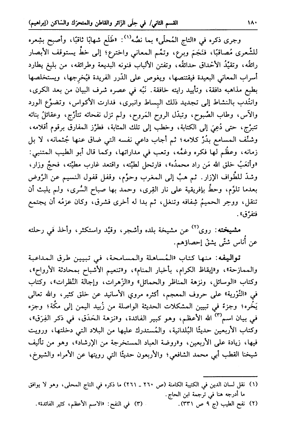 «وأتعب خلق الله من راد محمده» ، فارتحل لطيّته، واقتعد غارب مطيّته، فحجّ وزار، وشدّ للطّواف الإزار. ثم هبّ إلى المغرب وحوّم، وقفل قفول النسيم عن الرّوض بعدما تلوّم، وحطّ بإفريقية على نار القرى، وحمد بها صباح السّرى، ولم يلبث أن تنقل، ووحر الحميم شفافه وتنغل، ثم بدا له أخرى فشرق، وكان عزمه أن يجتمع فتفرّق» .