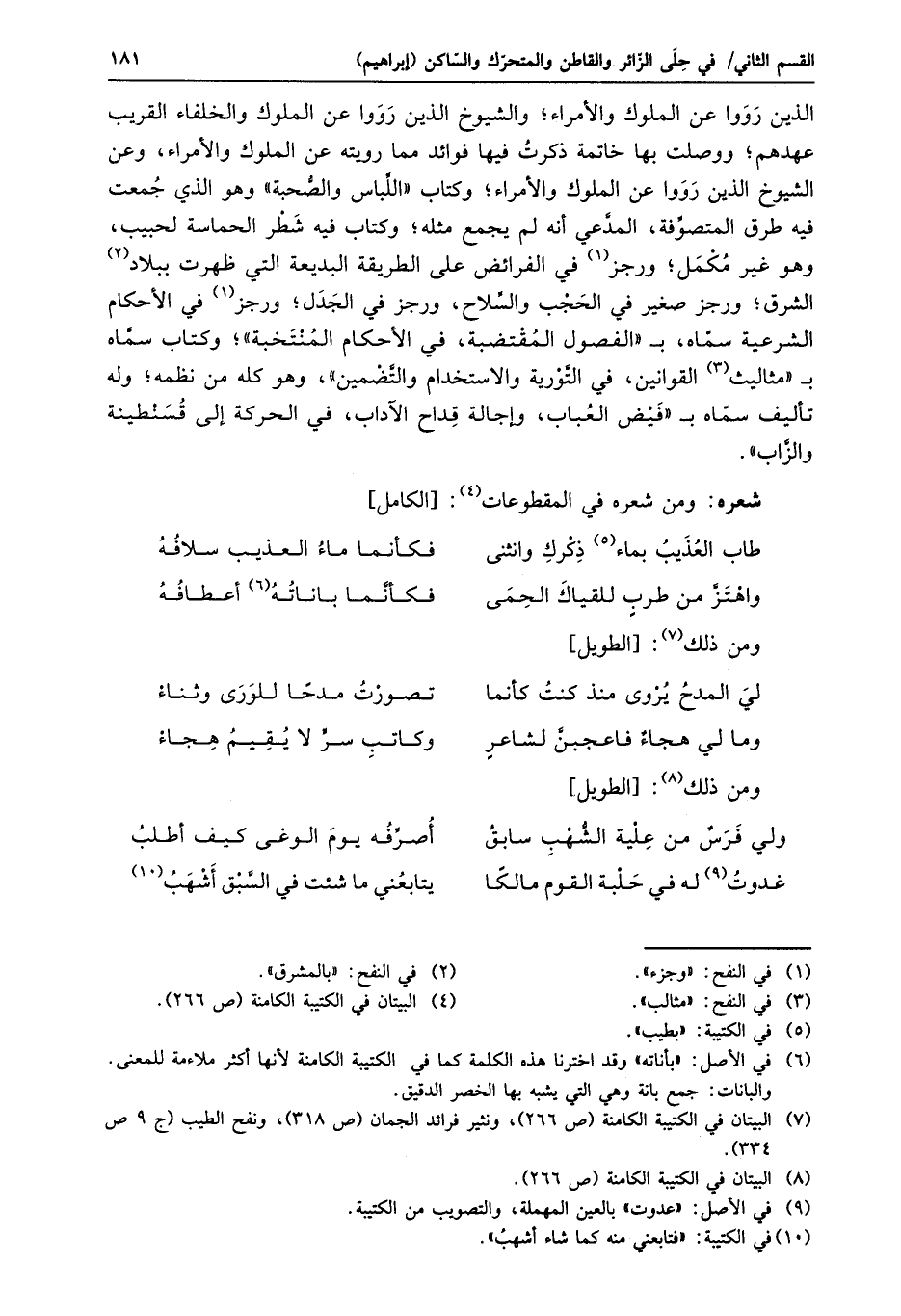 الذين رووا عن الملوك والأمراء؛ والشيوخ الذين رووا عن الملوك والخلفاء القريب عهدهم؛ ووصلت بها خاتمة ذكرت فيها فوائد مما رويته عن الملوك والأمراء، وعن الشيوخ الذين رووا عن الملوك والأمراء؛ وكتاب «اللّباس والصّحبة» وهو الذي جمعت فيه طرق المتصوّفة، المدّعي أنه لم يجمع مثله؛ وكتاب فيه شطر الحماسة لحبيب، وهو غير مكمل؛ ورجز «1» في الفرائض على الطريقة البديعة التي ظهرت ببلاد «2» الشرق؛ ورجز صغير في الحجب والسّلاح، ورجز في الجدل؛ ورجز «3» في الأحكام الشرعية سمّاه، ب «الفصول المقتضبة، في الأحكام المنتخبة» ؛ وكتاب سمّاه ب «مثاليث «4» القوانين، في التّورية والاستخدام والتّضمين» ، وهو كله من نظمه؛ وله تأليف سمّاه ب «فيض العباب، وإجالة قداح الآداب، في الحركة إلى قسنطينة والزّاب» .