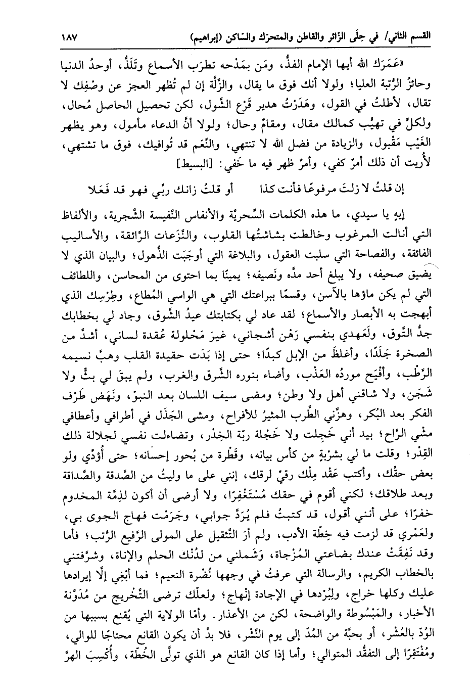 «عمرك الله أيها الإمام الفذّ، ومن بمدحه تطرب الأسماع وتلذّ، أوحد الدنيا وحائز الرّتبة العليا؛ ولولا أنك فوق ما يقال، والزّلّة إن لم تظهر العجز عن وصفك لا تقال، لأطلت في القول، وهدرت هدير قرع الشّول، لكن تحصيل الحاصل محال، ولكلّ في تهيّب كمالك مقال، ومقام وحال؛ ولولا أنّ الدعاء مأمول، وهو يظهر الغيب مقبول، والزيادة من فضل الله لا تنتهي، والنّعم قد توافيك، فوق ما تشتهي، لأريت أن ذلك أمر كفي، وأمر ظهر فيه ما خفي: [البسيط]