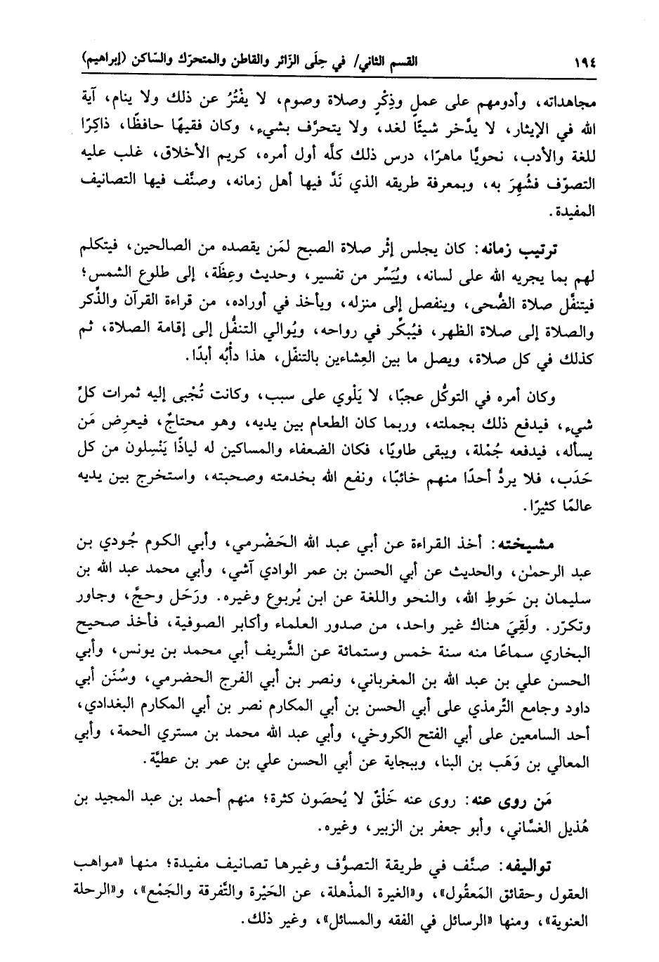 ترتيب زمانه: كان يجلس إثر صلاة الصبح لمن يقصده من الصالحين، فيتكلم لهم بما يجريه الله على لسانه، وييسّر من تفسير، وحديث وعظة، إلى طلوع الشمس؛ فيتنفّل صلاة الضّحى، وينفصل إلى منزله، ويأخذ في أوراده، من قراءة القرآن والذّكر والصلاة إلى صلاة الظهر، فيبكّر فى رواحه، ويوالي التنفّل إلى إقامة الصلاة، ثم كذلك في كل صلاة، ويصل ما بين العشاءين بالتنفّل، هذا دأبه أبدا.