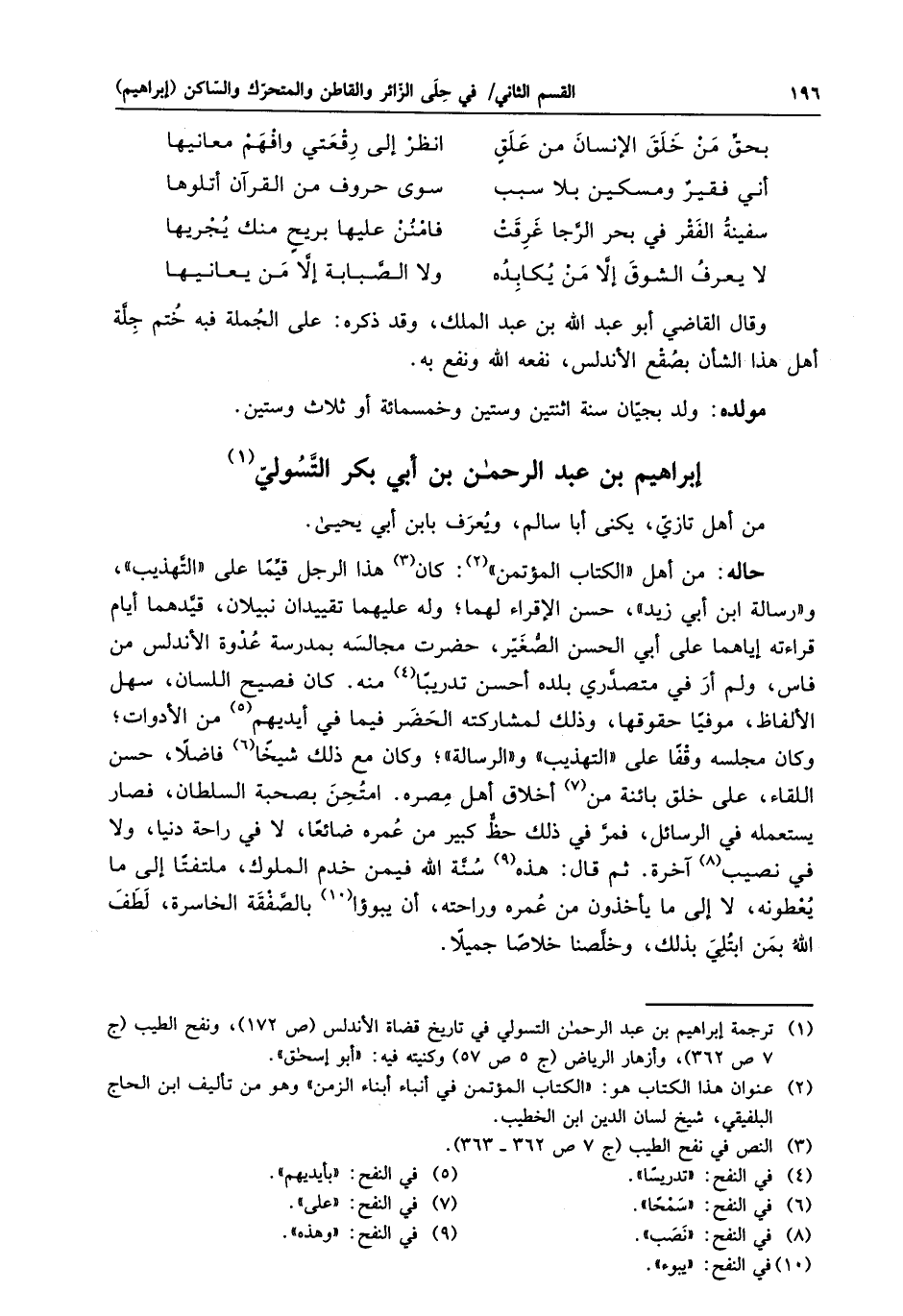 حاله: من أهل «الكتاب المؤتمن» «2» : كان «3» هذا الرجل قيّما على «التّهذيب» ، و «رسالة ابن أبي زيد» ، حسن الإقراء لهما؛ وله عليهما تقييدان نبيلان، قيّدهما أيام قراءته إياهما على أبي الحسن الصّغير، حضرت مجالسه بمدرسة عدوة الأندلس من فاس، ولم أر في متصدّري بلده أحسن تدريبا «4» منه. كان فصيح اللسان، سهل الألفاظ، موفيا حقوقها، وذلك لمشاركته الحضر فيما في أيديهم «5» من الأدوات؛ وكان مجلسه وقفا على «التهذيب» و «الرسالة» ؛ وكان مع ذلك شيخا «6» فاضلا، حسن اللقاء، على خلق بائنة من «7» أخلاق أهل مصره. امتحن بصحبة السلطان، فصار يستعمله في الرسائل، فمرّ في ذلك حظّ كبير من عمره ضائعا، لا في راحة دنيا، ولا في نصيب «8» آخرة. ثم قال: هذه «9» سنّة الله فيمن خدم الملوك، ملتفتا إلى ما يعطونه، لا إلى ما يأخذون من عمره وراحته، أن يبوؤا «10» بالصّفقة الخاسرة، لطف الله بمن ابتلي بذلك، وخلّصنا خلاصا جميلا.