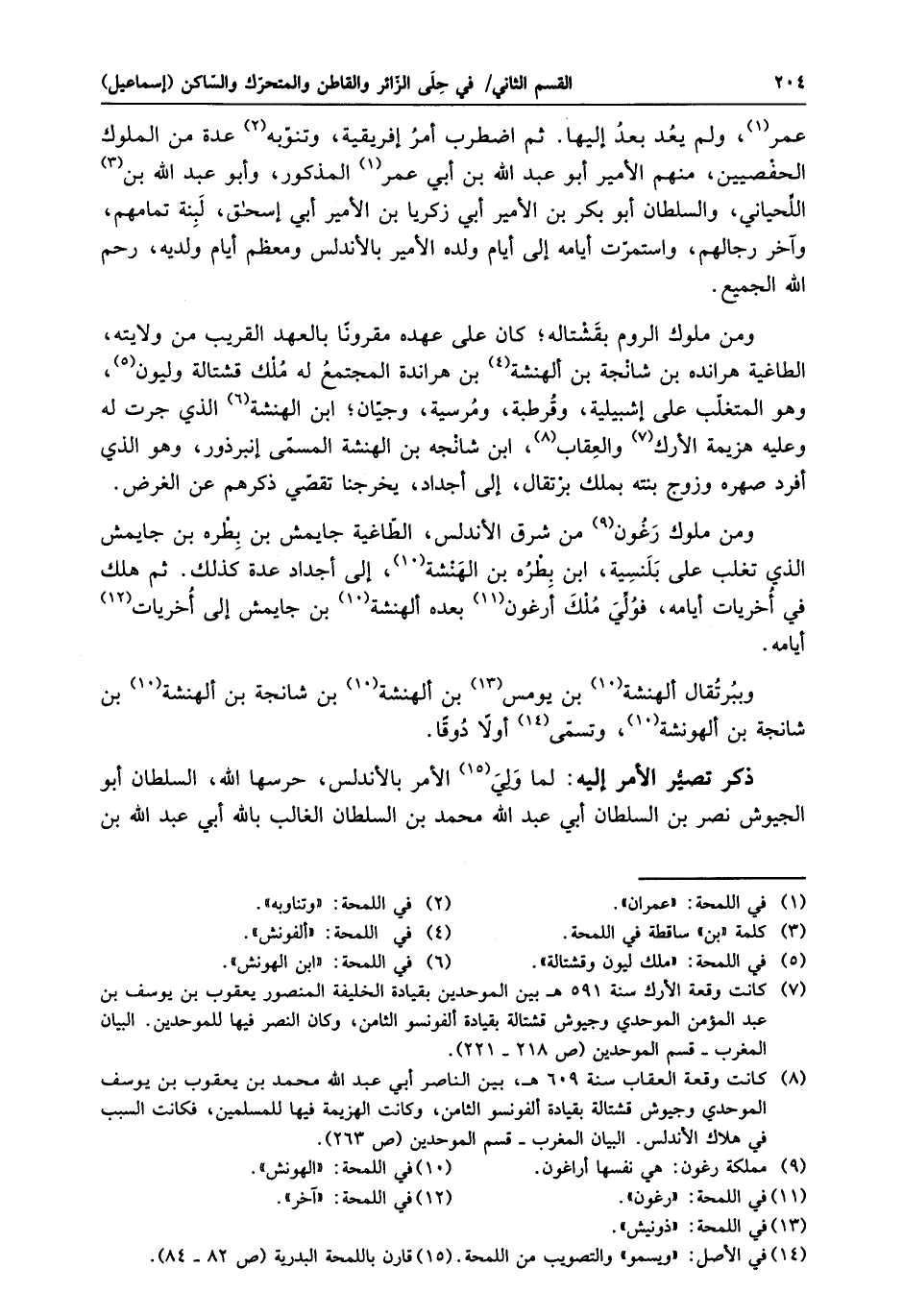 ومن ملوك الروم بقشتاله؛ كان على عهده مقرونا بالعهد القريب من ولايته، الطاغية هرانده بن شانجة بن ألهنشة «5» بن هراندة المجتمع له ملك قشتالة وليون «6» ، وهو المتغلّب على إشبيلية، وقرطبة، ومرسية، وجيّان؛ ابن الهنشة «7» الذي جرت له وعليه هزيمة الأرك «8» والعقاب «9» ، ابن شانجه بن الهنشة المسمّى إنبرذور، وهو الذي أفرد صهره وزوج بنته بملك برتقال، إلى أجداد، يخرجنا تقصّي ذكرهم عن الغرض.