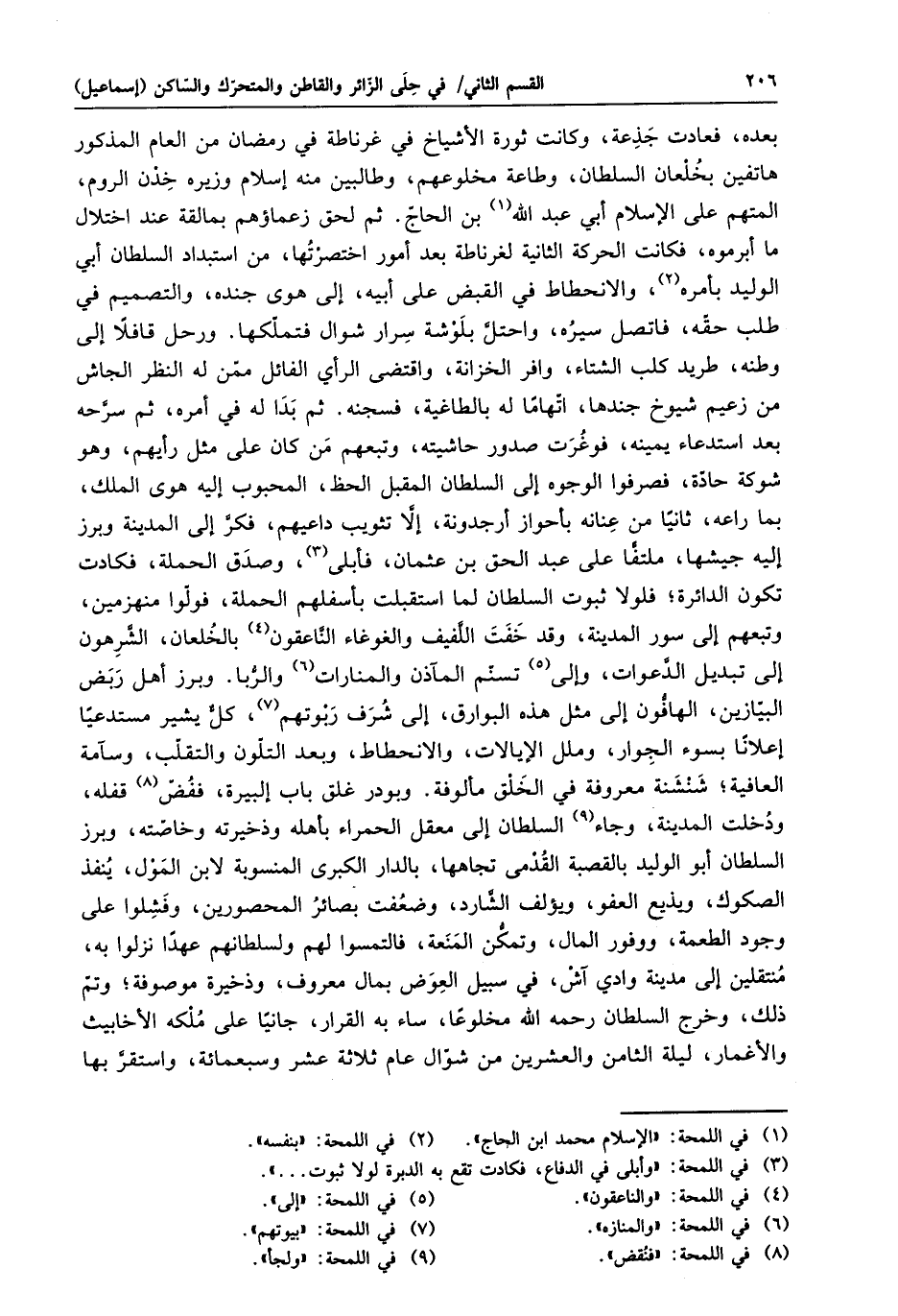 بعده، فعادت جذعة، وكانت ثورة الأشياخ في غرناطة في رمضان من العام المذكور هاتفين بخلعان السلطان، وطاعة مخلوعهم، وطالبين منه إسلام وزيره خدن الروم، المتهم على الإسلام أبي عبد الله «1» بن الحاجّ. ثم لحق زعماؤهم بمالقة عند اختلال ما أبرموه، فكانت الحركة الثانية لغرناطة بعد أمور اختصرتها، من استبداد السلطان أبي الوليد بأمره «2» ، والانحطاط في القبض على أبيه، إلى هوى جنده، والتصميم في طلب حقّه، فاتصل سيره، واحتلّ بلوشة سرار شوال فتملّكها. ورحل قافلا إلى وطنه، طريد كلب الشتاء، وافر الخزانة، واقتضى الرأي الفائل ممّن له النظر الجاش من زعيم شيوخ جندها، اتّهاما له بالطاغية، فسجنه. ثم بدا له في أمره، ثم سرّحه بعد استدعاء يمينه، فوغرت صدور حاشيته، وتبعهم من كان على مثل رأيهم، وهو شوكة حادّة، فصرفوا الوجوه إلى السلطان المقبل الحظ، المحبوب إليه هوى الملك، بما راعه، ثانيا من عنانه بأحواز أرجدونة، إلّا تثويب داعيهم، فكرّ إلى المدينة وبرز إليه جيشها، ملتفّا على عبد الحق بن عثمان، فأبلى»