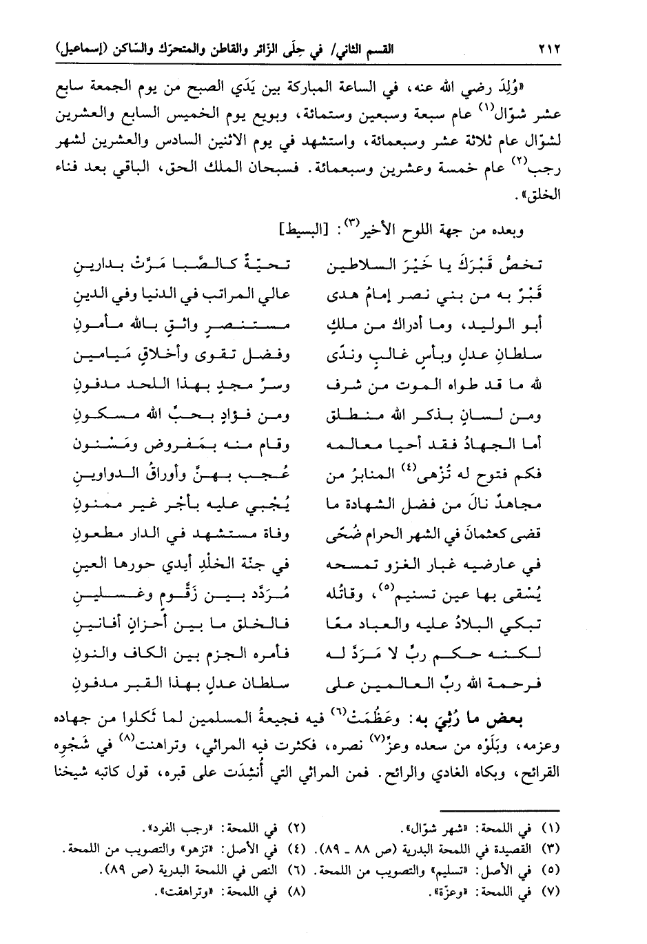 «ولد رضي الله عنه، في الساعة المباركة بين يدي الصبح من يوم الجمعة سابع عشر شوّال «1» عام سبعة وسبعين وستمائة، وبويع يوم الخميس السابع والعشرين لشوّال عام ثلاثة عشر وسبعمائة، واستشهد في يوم الاثنين السادس والعشرين لشهر رجب «2» عام خمسة وعشرين وسبعمائة. فسبحان الملك الحق، الباقي بعد فناء الخلق» .