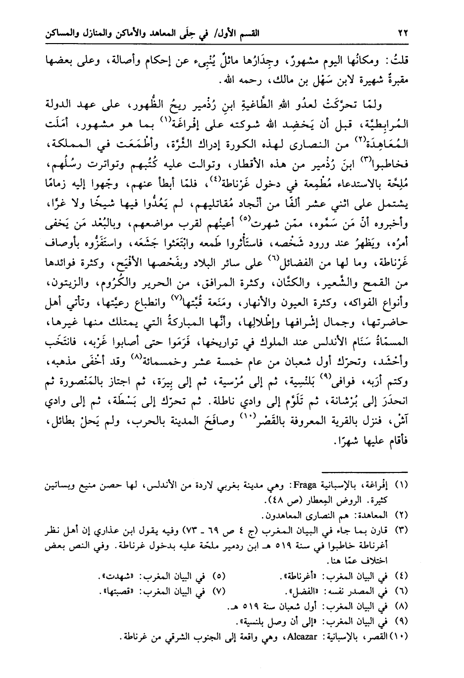 ولمّا تحرّكت لعدو الله الطّاغية ابن رذمير ريح الظّهور، على عهد الدولة المرابطيّة، قبل أن يخضد الله شوكته على إفراغة «1» بما هو مشهور، أملت المعاهدة «2» من النصارى لهذه الكورة إدراك الثّرّة، وأطمعت في المملكة، فخاطبوا «3» ابن رذمير من هذه الأقطار، وتوالت عليه كتبهم وتواترت رسلهم، ملحّة بالاستدعاء مطمعة في دخول غرناطة «4» ، فلمّا أبطأ عنهم، وجّهوا إليه زماما يشتمل على اثني عشر ألفا من أنجاد مقاتليهم، لم يعدّوا فيها شيخا ولا غرّا، وأخبروه أنّ من سمّوه، ممّن شهرت «5» أعينهم لقرب مواضعهم، وبالبعد من يخفى أمره، ويظهر عند ورود شخصه، فاستأثروا طمعه وابتعثوا جشعه، واستفزّوه بأوصاف غرناطة، وما لها من الفضائل «6» على سائر البلاد وبفحصها الأفيح، وكثرة فوائدها من القمح والشّعير، والكتّان، وكثرة المرافق، من الحرير والكروم، والزيتون، وأنواع الفواكه، وكثرة العيون والأنهار، ومنعة قبّتها «7» وانطباع رعيّتها، وتأتي أهل حاضرتها، وجمال إشرافها وإطلالها، وأنّها المباركة التي يمتلك منها غيرها، المسمّاة سنام الأندلس عند الملوك في تواريخها، فرموا حتى أصابوا غربه، فانتخب وأحشد، وتحرّك أول شعبان من عام خمسة عشر وخمسمائة «8» وقد أخفى مذهبه، وكتم أربه، فوافى «9» بلنسية، ثم إلى مرسية، ثم إلى بيرة، ثم اجتاز بالمنصورة ثم انحدر إلى برشانة، ثم تلوّم إلى وادي ناطلة. ثم تحرّك إلى بسطة، ثم إلى وادي آش، فنزل بالقرية المعروفة بالقصر «10» وصافح المدينة بالحرب، ولم يحل بطائل، فأقام عليها شهرا.