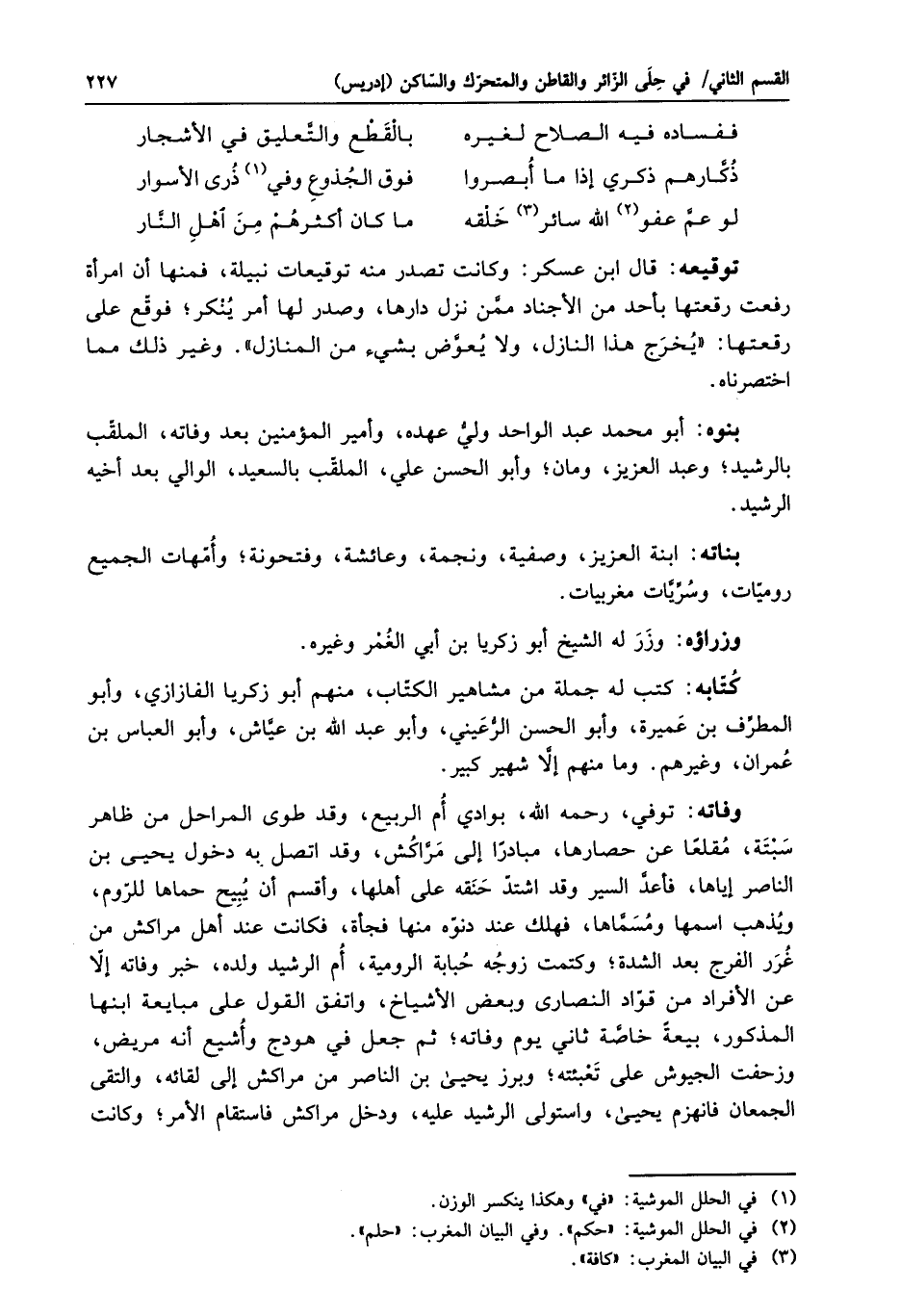 وفاته: توفي، رحمه الله، بوادي أم الربيع، وقد طوى المراحل من ظاهر سبتة، مقلعا عن حصارها، مبادرا إلى مرّاكش، وقد اتصل به دخول يحيى بن الناصر إياها، فأعدّ السير وقد اشتدّ حنقه على أهلها، وأقسم أن يبيح حماها للرّوم، ويذهب اسمها ومسمّاها، فهلك عند دنوّه منها فجأة، فكانت عند أهل مراكش من غرر الفرج بعد الشدة؛ وكتمت زوجه حبابة الرومية، أم الرشيد ولده، خبر وفاته إلّا عن الأفراد من قوّاد النصارى وبعض الأشياخ، واتفق القول على مبايعة ابنها المذكور، بيعة خاصّة ثاني يوم وفاته؛ ثم جعل في هودج وأشيع أنه مريض، وزحفت الجيوش على تعبئته؛ وبرز يحيى بن الناصر من مراكش إلى لقائه، والتقى الجمعان فانهزم يحيى، واستولى الرشيد عليه، ودخل مراكش فاستقام الأمر؛ وكانت