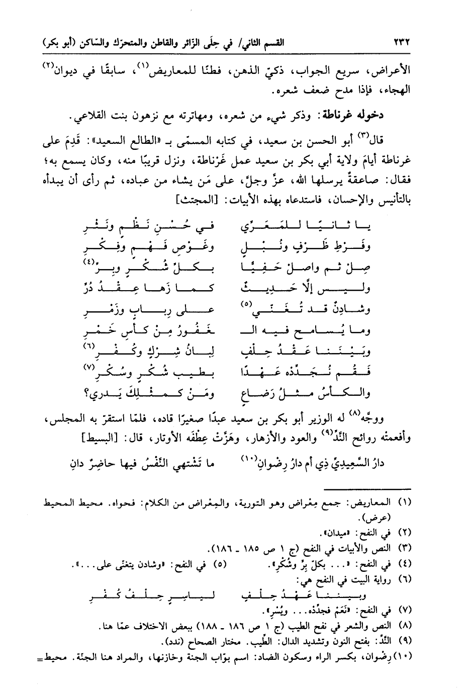 قال «3» أبو الحسن بن سعيد، في كتابه المسمّى ب «الطالع السعيد» : قدم على غرناطة أيام ولاية أبي بكر بن سعيد عمل غرناطة، ونزل قريبا منه، وكان يسمع به؛ فقال: صاعقة يرسلها الله، عزّ وجلّ، على من يشاء من عباده، ثم رأى أن يبدأه بالتأنيس والإحسان، فاستدعاه بهذه الأبيات: [المجتث]