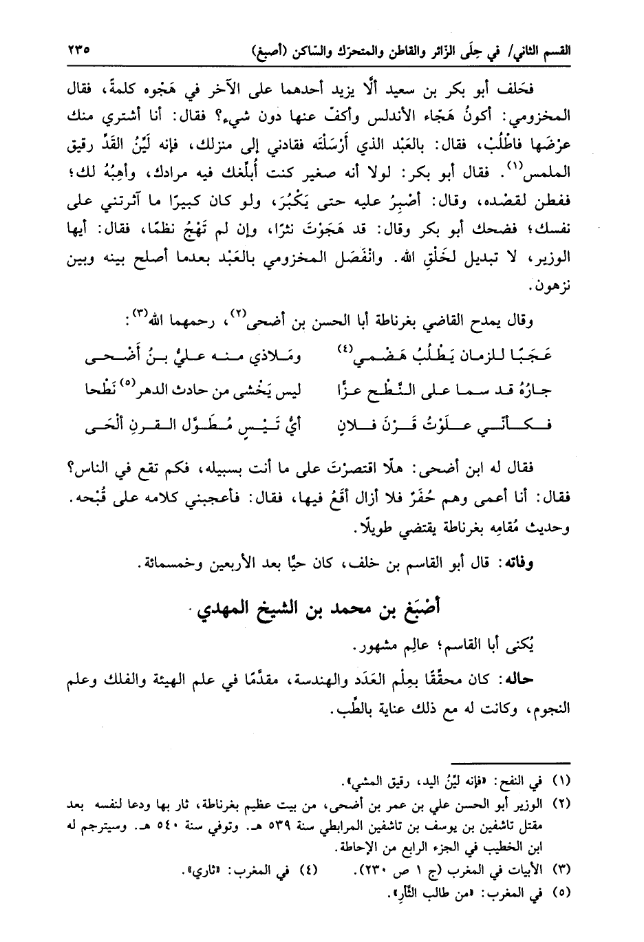 فحلف أبو بكر بن سعيد ألّا يزيد أحدهما على الآخر في هجوه كلمة، فقال المخزومي: أكون هجّاء الأندلس وأكفّ عنها دون شيء؟ فقال: أنا أشتري منك عرضها فاطلب، فقال: بالعبد الذي أرسلته فقادني إلى منزلك، فإنه ليّن القدّ رقيق الملمس «1» . فقال أبو بكر: لولا أنه صغير كنت أبلّغك فيه مرادك، وأهبه لك؛ ففطن لقصده، وقال: أصبر عليه حتى يكبر، ولو كان كبيرا ما آثرتني على نفسك؛ فضحك أبو بكر وقال: قد هجوت نثرا، وإن لم تهج نظما، فقال: أيها الوزير، لا تبديل لخلق الله. وانفصل المخزومي بالعبد بعدما أصلح بينه وبين نزهون.