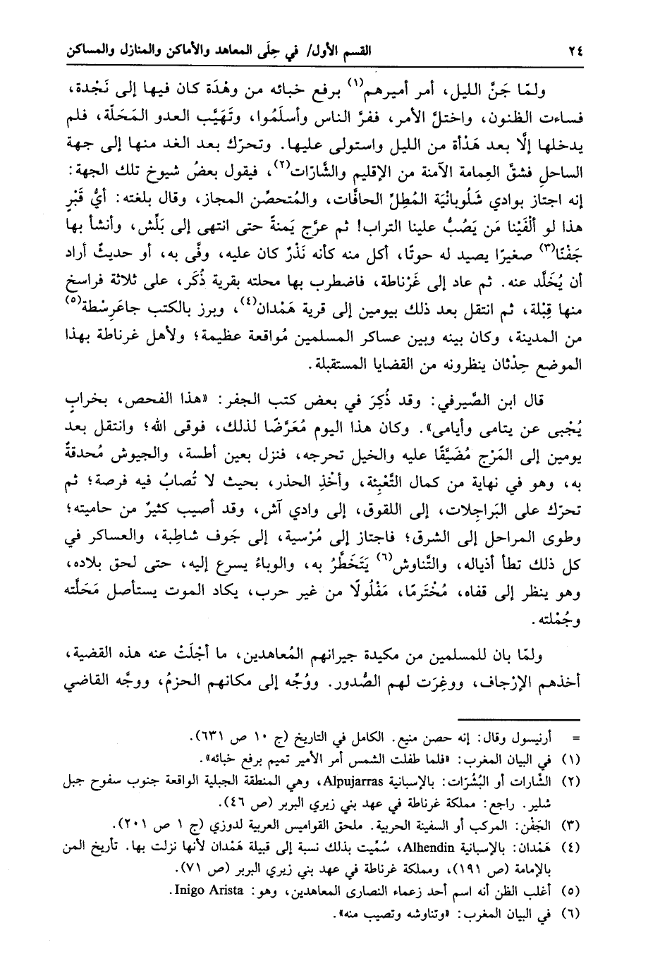 إنه اجتاز بوادي شلوبانية المطلّ الحافّات، والمتحصّن المجاز، وقال بلغته: أيّ قبر هذا لو ألفينا من يصبّ علينا التراب! ثم عرّج يمنة حتى انتهى إلى بلّش، وأنشأ بها جفنا «3» صغيرا يصيد له حوتا، أكل منه كأنه نذر كان عليه، وفّى به، أو حديث أراد أن يخلّد عنه، ثم عاد إلى غرناطة، فاضطرب بها محلته بقرية ذكر، على ثلاثة فراسخ منها قبلة، ثم انتقل بعد ذلك بيومين إلى قرية همدان «4» ، وبرز بالكتب جاعرسطة «5» من المدينة، وكان بينه وبين عساكر المسلمين مواقعة عظيمة؛ ولأهل غرناطة بهذا الموضع حدثان ينظرونه من القضايا المستقبلة.