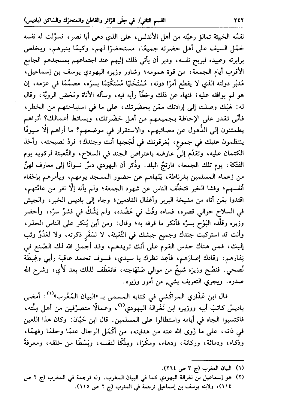 نفسه الخبيثة تمالؤ رعيّته من أهل الأندلس، على الذي دهى أبا نصر، فسوّلت له نفسه حمل السيف على أهل حضرته جميعا، مستحضرا لهم، وكيما ينبرهم، ويخلص برابرته وعبيده فيريح نفسه، ودبر أن يأتي ذلك إليهم عند اجتماعهم بمسجدهم الجامع الأقرب أيام الجمعة، من قوة همومه؛ وشاور وزيره اليهودي يوسف بن إسماعيل، مدبّر دولته الذي لا يقطع أمرا دونه، مستخليا مستكتما بسرّه، مصمّما في عزمه، إن هو لم يوافقه عليه؛ فنهاه عن ذلك وخطّأ رأيه فيه، وسأله الأناة ومحض الرويّة، وقال له: هبك وصلت إلى إرادتك ممّن بحضرتك، على ما في استباحتهم من الخطر، فأنّى تقدر على الإحاطة بجميعهم من أهل حضرتك، وبسائط أعمالك؟ أتراهم يطمئنون إلى الذّهول عن مصائبهم، والاستقرار في موضعهم؟ ما أراهم إلّا سيوفا ينتظمون عليك في جموع، يغرقونك في لججها أنت وجندك؛ فردّ نصيحته، وأخذ الكتمان عليه، وتقدّم إلى عارضه باعتراض الجند في السلاح، والتّعبئة لركوبه يوم الفتكة، يوم تلك الجمعة، فارتجّ البلد. وذكر أن اليهودي دسّ نسوانا إلى معارف لهنّ من زعماء المسلمين بغرناطة، ينهاهم عن حضور المسجد يومهم، ويأمرهم بإخفاء أنفسهم؛ وفشا الخبر فتخلّف الناس عن شهود الجمعة؛ ولم يأته إلّا نفر من عامّتهم، اقتدوا بمن أتاه من مشيخة البربر وأغفال القادمين؛ وجاء إلى باديس الخبر، والجيش في السلاح حوالي قصره، فساءه وفتّ في عضده، ولم يشكّ في فشوّ سرّه، وأحضر وزيره وقلّده البوح بسرّه فأنكر ما قرفه به؛ وقال: ومن أين ينكر على الناس الحذر، وأنت قد استركبت جندك وجميع جيشك في التّعبئة، لا لسفر ذكرته، ولا لعدوّ وثب إليك، فمن هناك حدس القوم على أنك تريدهم، وقد أجمل الله لك الصّنع في نفارهم، وقادك إصارهم، فأعد نظرك يا سيدي، فسوف تحمد عاقبة رأيي وغبطة نصحي. فنصّح وزيره شيخ من موالي صنهاجته، فانعطف لذلك بعد لأي، وشرح الله صدره. ويجري التعريف بشيء من أمور وزيره.