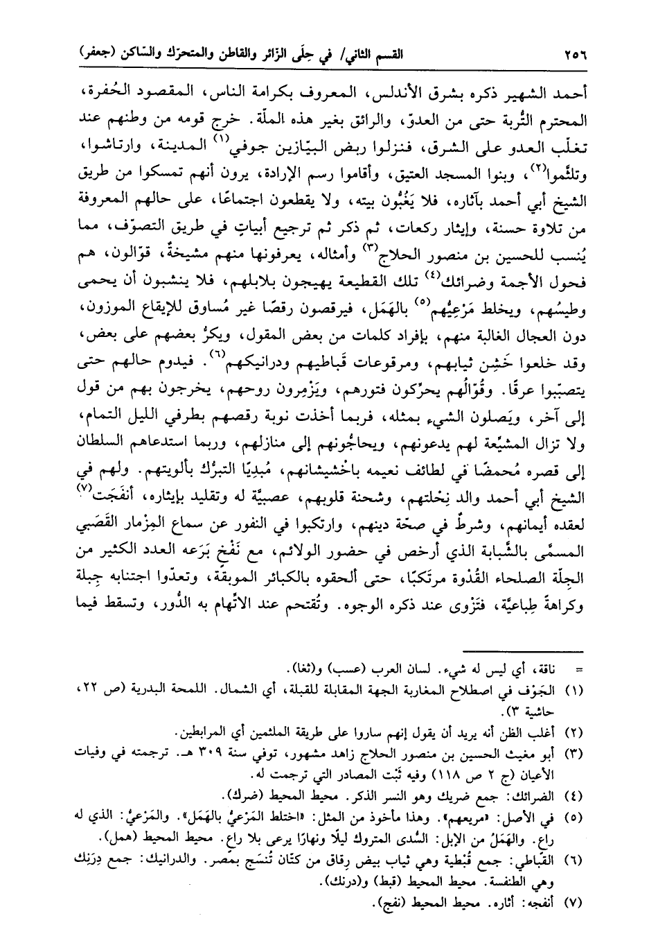 أحمد الشهير ذكره بشرق الأندلس، المعروف بكرامة الناس، المقصود الحفرة، المحترم التّربة حتى من العدوّ، والرائق بغير هذه الملّة. خرج قومه من وطنهم عند تغلّب العدو على الشرق، فنزلوا ربض البيّازين جوفي «1» المدينة، وارتاشوا، وتلثّموا «2» ، وبنوا المسجد العتيق، وأقاموا رسم الإرادة، يرون أنهم تمسكوا من طريق الشيخ أبي أحمد بآثاره، فلا يغبّون بيته، ولا يقطعون اجتماعا، على حالهم المعروفة من تلاوة حسنة، وإيثار ركعات، ثم ذكر ثم ترجيع أبيات في طريق التصوّف، مما ينسب للحسين بن منصور الحلاج «3» وأمثاله، يعرفونها منهم مشيخة، قوّالون، هم فحول الأجمة وضرائك «4» تلك القطيعة يهيجون بلابلهم، فلا ينشبون أن يحمى وطيسهم، ويخلط مرعيّهم «5» بالهمل، فيرقصون رقصا غير مساوق للإيقاع الموزون، دون العجال الغالبة منهم، بإفراد كلمات من بعض المقول، ويكرّ بعضهم على بعض، وقد خلعوا خشن ثيابهم، ومرقوعات قباطيهم ودرانيكهم «6» . فيدوم حالهم حتى يتصبّبوا عرقا. وقوّالهم يحرّكون فتورهم، ويزمرون روحهم، يخرجون بهم من قول إلى آخر، ويصلون الشيء بمثله، فربما أخذت نوبة رقصهم بطرفي الليل التمام، ولا تزال المشيّعة لهم يدعونهم، ويحاجّونهم إلى منازلهم، وربما استدعاهم السلطان إلى قصره محمضا في لطائف نعيمه باخشيشانهم، مبديا التبرّك بألويتهم. ولهم في الشيخ أبي أحمد والد نحلتهم، وشحنة قلوبهم، عصبيّة له وتقليد بإيثاره، أنفجت «7» لعقده أيمانهم، وشرط في صحّة دينهم، وارتكبوا في النفور عن سماع المزمار القصبي المسمّى بالشّبابة الذي أرخص في حضور الولائم، مع نفخ برعه العدد الكثير من الجلّة الصلحاء القدوة مرتكبا، حتى ألحقوه بالكبائر الموبقة، وتعدّوا اجتنابه جبلة وكراهة طباعيّة، فتزوى عند ذكره الوجوه. وتقتحم عند الاتّهام به الدّور، وتسقط فيما