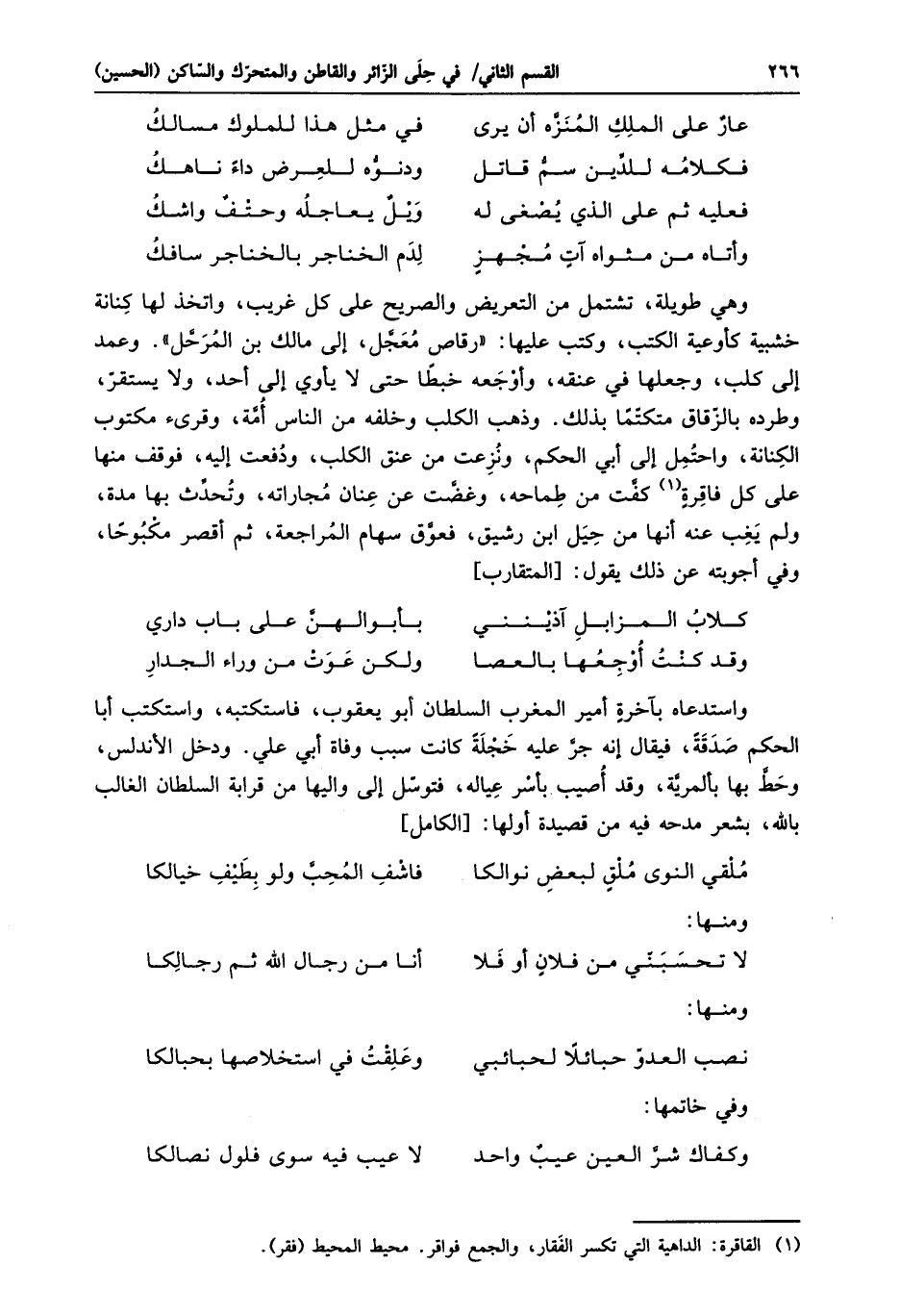 وهي طويلة، تشتمل من التعريض والصريح على كل غريب، واتخذ لها كنانة خشبية كأوعية الكتب، وكتب عليها: «رقاص معجّل، إلى مالك بن المرحّل» . وعمد إلى كلب، وجعلها في عنقه، وأوجعه خبطا حتى لا يأوي إلى أحد، ولا يستقرّ، وطرده بالزّقاق متكتّما بذلك. وذهب الكلب وخلفه من الناس أمّة، وقرىء مكتوب الكنانة، واحتمل إلى أبي الحكم، ونزعت من عنق الكلب، ودفعت إليه، فوقف منها على كل فاقرة «1» كفّت من طماحه، وغضّت عن عنان مجاراته، وتحدّث بها مدة، ولم يغب عنه أنها من حيل ابن رشيق، فعوّق سهام المراجعة، ثم أقصر مكبوحا، وفي أجوبته عن ذلك يقول: [المتقارب]