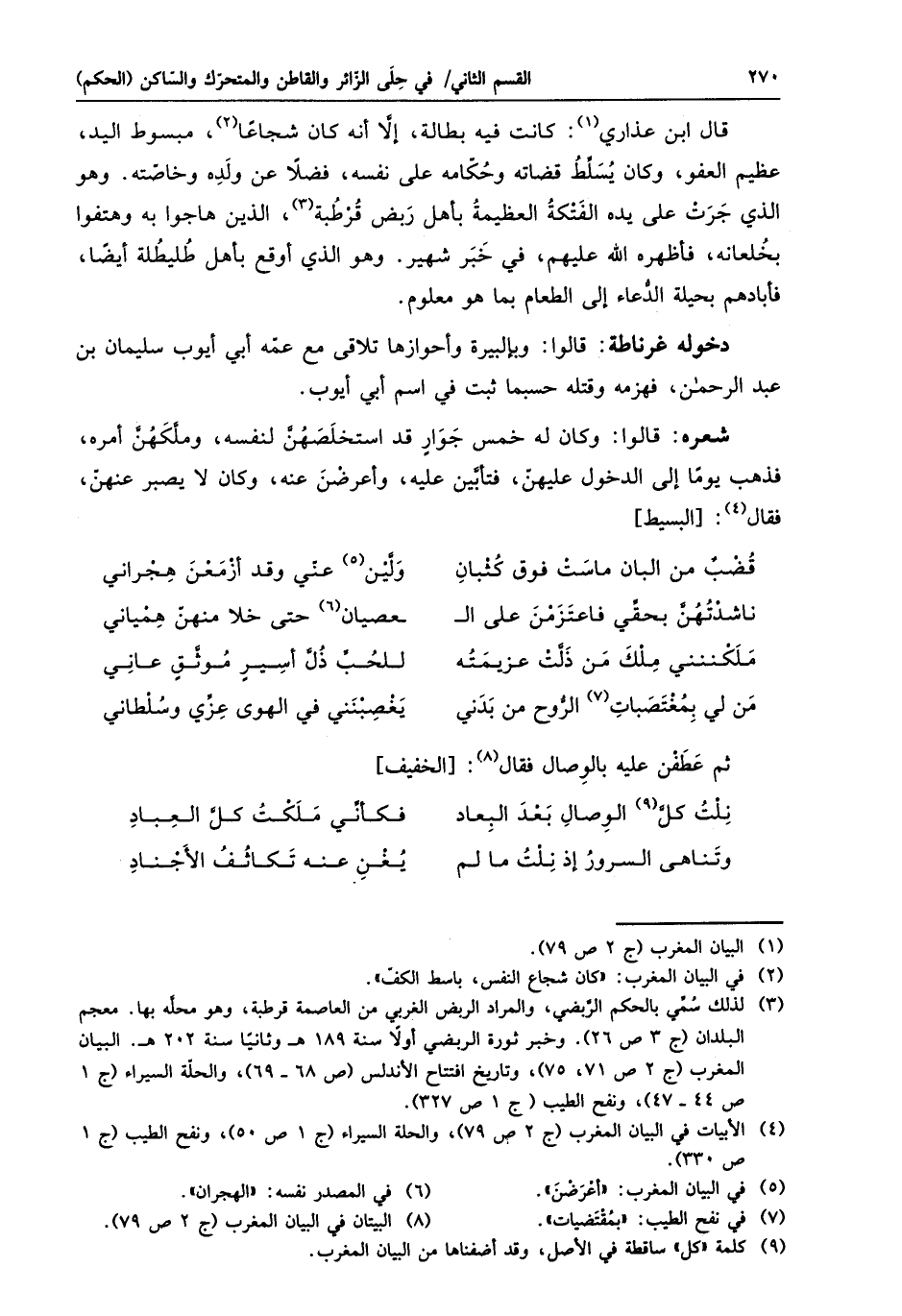 قال ابن عذاري «1» : كانت فيه بطالة، إلّا أنه كان شجاعا «2» ، مبسوط اليد، عظيم العفو، وكان يسلّط قضاته وحكّامه على نفسه، فضلا عن ولده وخاصّته. وهو الذي جرت على يده الفتكة العظيمة بأهل ربض قرطبة «3» ، الذين هاجوا به وهتفوا بخلعانه، فأظهره الله عليهم، في خبر شهير. وهو الذي أوقع بأهل طليطلة أيضا، فأبادهم بحيلة الدّعاء إلى الطعام بما هو معلوم.
