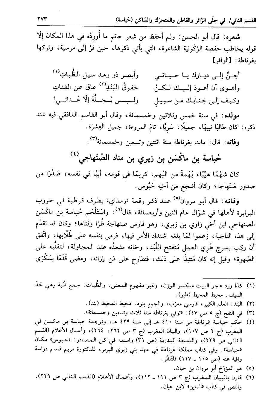 وفاته: قال أبو مروان «5» عند ذكر وقعة «رمداي» بطرف قرطبة في حروب البرابرة لأهلها في شوّال عام اثنين وأربعمائة، قال «6» : واستلحم حباسة بن ماكسن الصنهاجي ابن أخي زاوي بن زيري، وهو فارس صنهاجة طرّا وفتاها؛ وكان قد تقدّم إلى هذه الناحية، زعموا لمّا بلغه اشتداد الأمر فيها، فرمى بنفسه على طلّابها، واتّفق أن ركب بسرج طري العمل متفتح اللّبد، وخانه مقعده عند المجاولة، لتقلّبه على الصّهوة؛ وقيل إنه كان منتبذا على ذلك، فتطارح على من بإزائه، ومضى قدما بسكرى