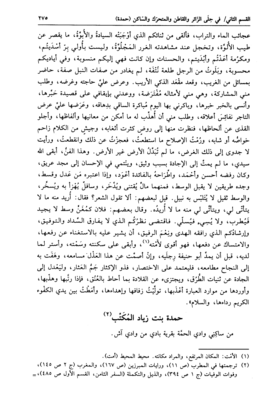 عجائب الماء والتراب، فألقى من ثنائكم الذي أوجبته السيادة والأبوّة، ما يقصر عن طيب الألوّة، وتخجل عند مشاهدته الغرر المجلوّة، وليست بأولي برّ أسديتم، ومكرمة أعدتم وأبديتم، والحسنات وإن كانت فهي إليكم منسوبة، وفي أياديكم محسوبة، وبلوت من الرجل طلعة نتفة، لم يغادر من صفات النبل صفة، حاضر بمسائل من الغريب، وقعد مقعد الذكي الأريب. وعرض عليّ حاجته وغرضه، وطلب مني المشاركة، وهي مني لأمثاله مفترضة، ووعدني بإيقافي على قصيدة حبّرها، وأنسى بالخبر خبرها، وباكرني بها اليوم مباكرة الساقي بدهاقه، وعرضها عليّ عرض التاجر نفائس أعلاقه، وطلب مني أن أهذّب له ما أمكن من معانيها وألفاظها، وأجلو القذى عن ألحاظها، فنظرت منها إلى روض كثرت أثغابه، وجيش من الكلام زاحم خواصّه أو شابه، ورمت الإصلاح ما استطعت، فعجزت عن ذلك وانقطعت، ورأيت لا جدوى إلى ذلك الغرض، ما لم تبدّل الأرض غير الأرض. وهذا الفنّ، أبقى الله سيدي، ما لم يمتّ إلى الإجادة بسبب وثيق، وينتمي في الإحسان إلى مجد عريق، وكان رفضه أحسن وأحمد، واطّراحه بالفائدة أعود، وإذا اعتبره من عدل وقسط، وجده طريقين لا يقبل الوسط، فمنهما مالّ يقتنى ويدّخر، وسافل يهزأ به ويسخّر، والوسط ثقيل لا يتلبّس به نبيل. قيل لبعضهم: ألا تقول الشعر؟ فقال: أريد منه ما لا يتأتّى لي، ويتأتّى لي منه ما لا أريده. وقال بعضهم: فلان كمغنّ وسط لا يجيد فيطرب، ولا يسيء فيسلّي. فاقتضى نظركم الذي لا يفارق السّداد والتوفيق، وإرشادكم الذي رافقه الهدى ونعم الرفيق، أن يشير عليه بالاستغناء عن رفعها، والامتساك عن دفعها، فهو أقوى لأمته «1» ، وأبقى على سكنته وسمته، وأستر لما لديه، قبل أن يمدّ أبو حنيفة رجليه، وإن أصمّت عن هذا العذل مسامعه، وهفت به إلى النجاح مطامعه، فليعتمد على الاختصار، فذو الإكثار جمّ العثار، وليعدل إلى الجادة عن ثنيات الطّرق، ويجتزئ عن القلادة بما أحاط بالعنق، فإذا رتّبها وهذّبها، وأوردها من موارد العبارة أعذبها، تولّيت زفافها وإهداءها، وأمطت بين يدي الكفوء الكريم رداءها، والسلام» .