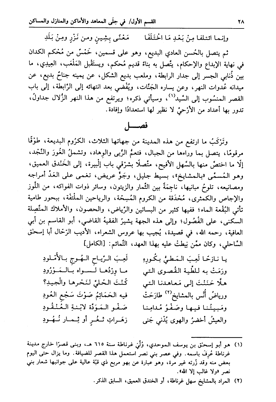 وتركب ما ارتفع من هذه المدينة من جهاتها الثلاث، الكروم البديعة، طوقا مرقوما، يتصل بما وراءها من الجبال، فتعمّ الرّبى والوهاد، وتشمل الغور والنّجد، إلّا ما اختصّ منها بالسّهل الأفيح، متّصلا بشرقي باب إلبيرة، إلى الخندق العميق، وهو المسمّى «بالمشايخ» ، بسيط جليل، وجوّ عريض، تغمى على العدّ أمراجه ومصانيعه، تلوح مبانيها، ناجمة بين الثّمار والزيتون، وسائر ذوات الفواكه، من اللّوز والإجاص والكمثرى، محدقة من الكروم المسحّة، والرياحين الملتفّة، ببحور طامية تأتي البقعة الماء؛ ففيها كثير من البساتين والرّياض، والحصون، والأملاك المتّصلة السكنى، على الفصول؛ وإلى هذه الجهة يشير الفقيه القاضي، أبو القاسم بن أبي العافية، رحمه الله، في قصيدة، يجيب بها عروس الشعراء، الأديب الرّحّال أبا إسحاق السّاحلي، وكان ممّن نيطت عليه بهذا العهد، التّمائم: [الكامل]