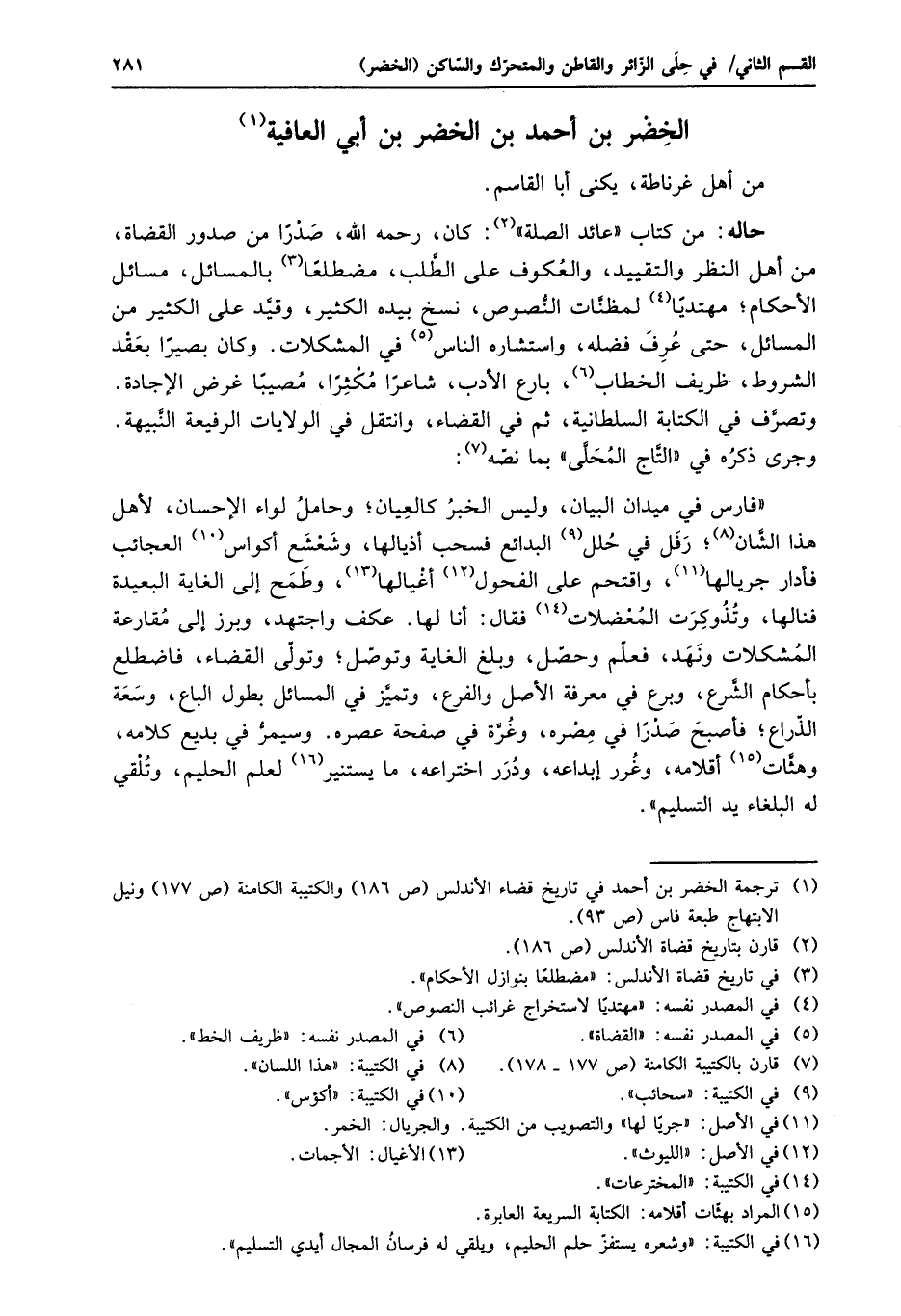 «فارس في ميدان البيان، وليس الخبر كالعيان؛ وحامل لواء الإحسان، لأهل هذا الشّان «8» ؛ رفل في حلل «9» البدائع فسحب أذيالها، وشعشع أكواس «10» العجائب فأدار جريالها «11» ، واقتحم على الفحول «12» أغيالها «13» ، وطمح إلى الغاية البعيدة فنالها، وتذوكرت المعضلات «14» فقال: أنا لها. عكف واجتهد، وبرز إلى مقارعة المشكلات ونهد، فعلّم وحصّل، وبلغ الغاية وتوصّل؛ وتولّى القضاء، فاضطلع بأحكام الشّرع، وبرع في معرفة الأصل والفرع، وتميّز في المسائل بطول الباع، وسعة الذّراع؛ فأصبح صدرا في مصره، وغرّة في صفحة عصره. وسيمرّ في بديع كلامه، وهثّات «15» أقلامه، وغرر إبداعه، ودرر اختراعه، ما يستنير «16» لعلم الحليم، وتلقي له البلغاء يد التسليم» .