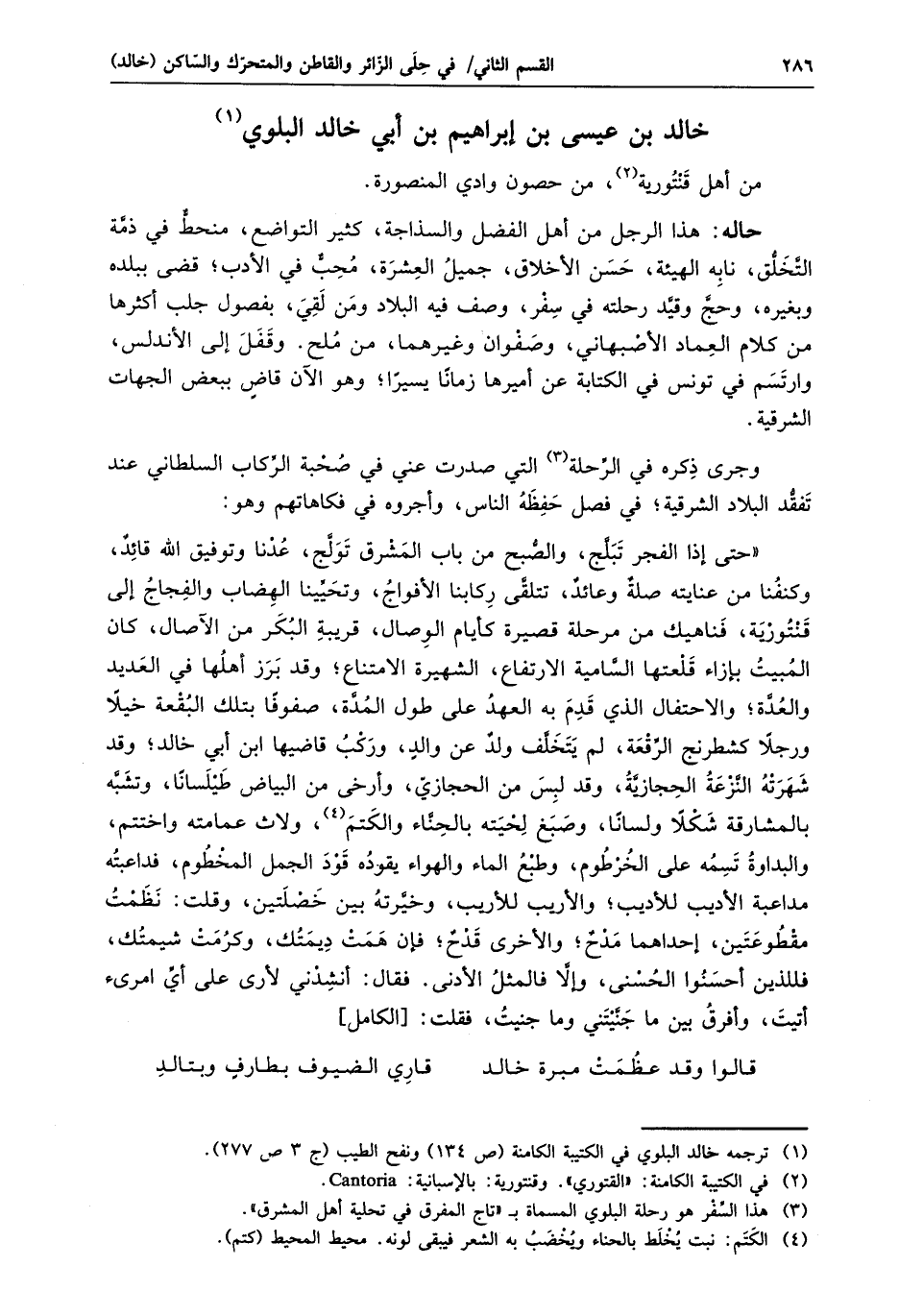 «حتى إذا الفجر تبلّج، والصّبح من باب المشرق تولّج، عدنا وتوفيق الله قائد، وكنفنا من عنايته صلة وعائد، تتلقّى ركابنا الأفواج، وتحيّينا الهضاب والفجاج إلى قنتورية، فناهيك من مرحلة قصيرة كأيام الوصال، قريبة البكر من الآصال، كان المبيت بإزاء قلعتها السّامية الارتفاع، الشهيرة الامتناع؛ وقد برز أهلها في العديد والعدّة؛ والاحتفال الذي قدم به العهد على طول المدّة، صفوفا بتلك البقعة خيلا ورجلا كشطرنج الرّقعة، لم يتخلّف ولد عن والد، وركب قاضيها ابن أبي خالد؛ وقد شهرته النّزعة الحجازيّة، وقد لبس من الحجازيّ، وأرخى من البياض طيلسانا، وتشبّه بالمشارقة شكلا ولسانا، وصبغ لحيته بالحنّاء والكتم «4» ، ولاث عمامته واختتم، والبداوة تسمه على الخرطوم، وطبع الماء والهواء يقوده قود الجمل المخطوم، فداعبته مداعبة الأديب للأديب؛ والأريب للأريب، وخيّرته بين خصلتين، وقلت: نظمت مقطوعتين، إحداهما مدح؛ والأخرى قدح؛ فإن همت ديمتك، وكرمت شيمتك، فللذين أحسنوا الحسنى، وإلّا فالمثل الأدنى. فقال: أنشدني لأرى على أيّ امرئ أتيت، وأفرق بين ما جنّيتني وما جنيت، فقلت: [الكامل]