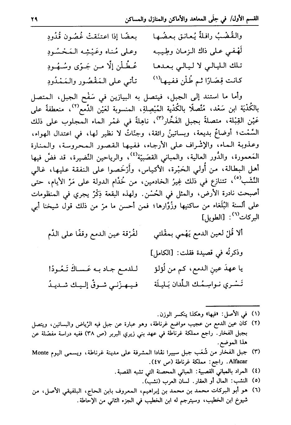 وأما ما استند إلى الجبل، فيتصل به البيازين في سفح الجبل، المتصل بالكدية ابن سعد، متّصلا بالكدية المبصلة، المنسوبة لعين الدّمع «2» ، منعطفة على عين القبلة، متصلة بجبل الفخّار «3» ، ناهلة في غمر الماء المجلوب على ذلك السّمت؛ أوضاع بديعة، وبساتين رائقة، وجنّات لا نظير لها، في اعتدال الهواء، وعذوبة الماء، والإشراف على الأرجاء، ففيها القصور المحروسة، والمنارة المعمورة، والدّور العالية، والمباني القصبيّة «4» ، والرياحين النّضيرة، قد فضّ فيها أهل البطالة، من أولي الحبرة، الأكياس، وأرخصوا على النفقة عليها، غالي النّشب «5» ، تتنازع في ذلك غير الخادمين، من خدّام الدولة على مرّ الأيام، حتى أصبحت نادرة الأرض، والمثل في الحسن. ولهذه البقعة ذكر يجري في المنظومات على ألسنة البلغاء من ساكنيها وزوّارها؛ فمن أحسن ما مرّ من ذلك قول شيخنا أبي البركات «6» : [الطويل]