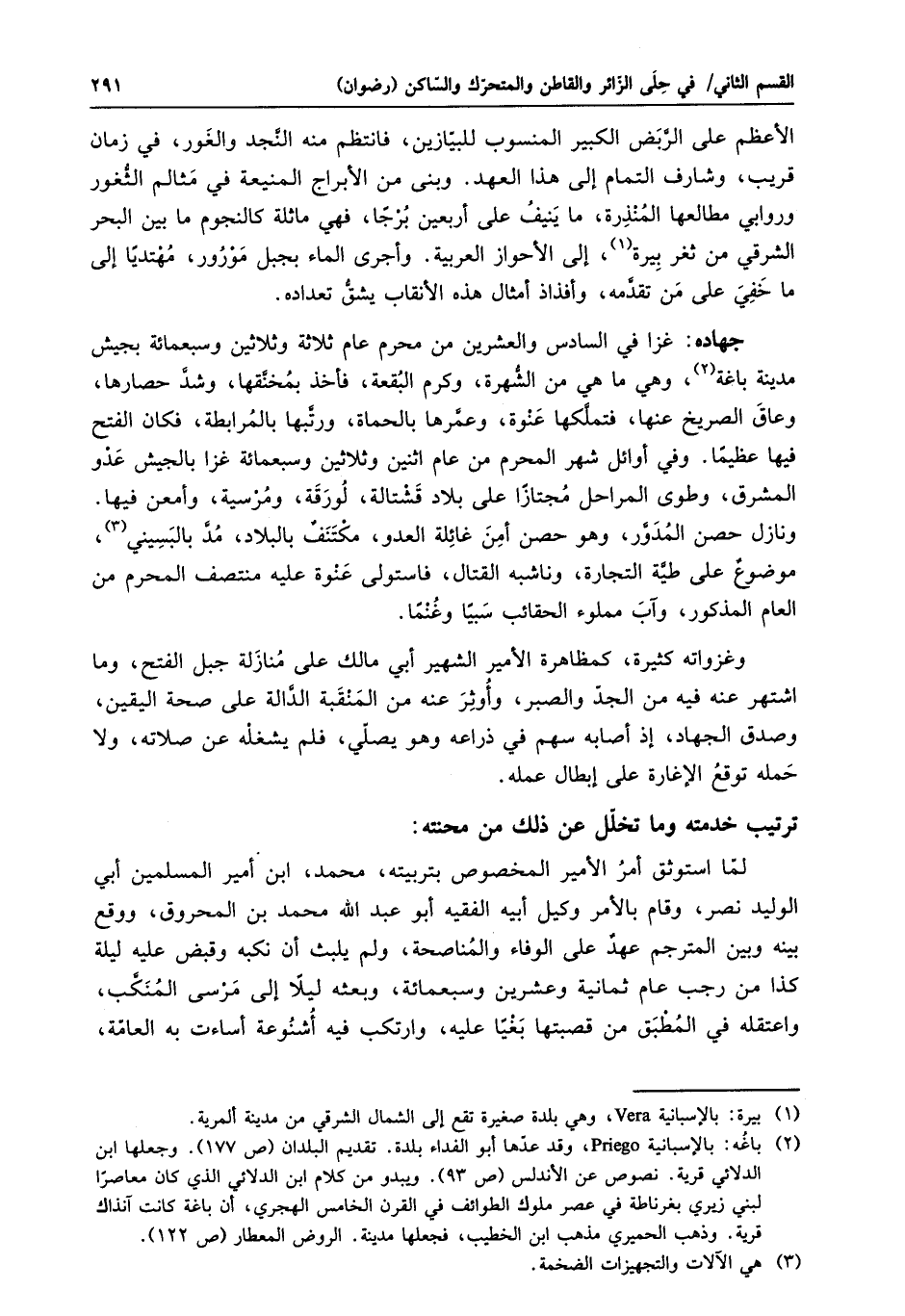 الأعظم على الرّبض الكبير المنسوب للبيّازين، فانتظم منه النّجد والغور، في زمان قريب، وشارف التمام إلى هذا العهد. وبنى من الأبراج المنيعة في مثالم الثّغور وروابي مطالعها المنذرة، ما ينيف على أربعين برجا، فهي ماثلة كالنجوم ما بين البحر الشرقي من ثغر بيرة «1»