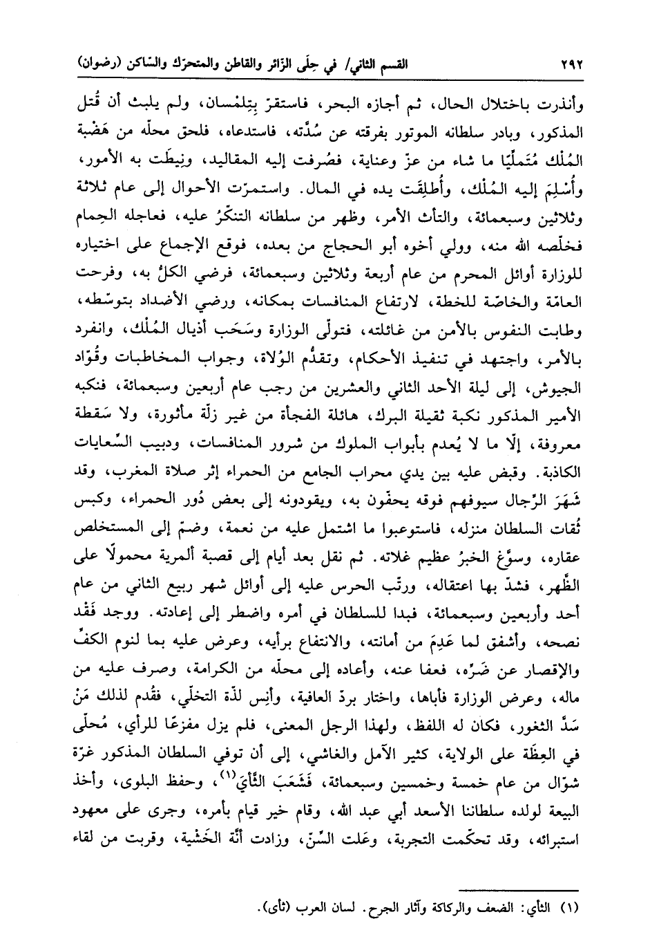 وأنذرت باختلال الحال، ثم أجازه البحر، فاستقرّ بتلمسان، ولم يلبث أن قتل المذكور، وبادر سلطانه الموتور بفرقته عن سدّته، فاستدعاه، فلحق محلّه من هضبة الملك متملّيا ما شاء من عزّ وعناية، فصرفت إليه المقاليد، ونيطت به الأمور، وأسلم إليه الملك، وأطلقت يده في المال. واستمرّت الأحوال إلى عام ثلاثة وثلاثين وسبعمائة، والتأث الأمر، وظهر من سلطانه التنكّر عليه، فعاجله الحمام فخلّصه الله منه، وولي أخوه أبو الحجاج من بعده، فوقع الإجماع على اختياره للوزارة أوائل المحرم من عام أربعة وثلاثين وسبعمائة، فرضي الكلّ به، وفرحت العامّة والخاصّة للخطة، لارتفاع المنافسات بمكانه، ورضي الأضداد بتوسّطه، وطابت النفوس بالأمن من غائلته، فتولّى الوزارة وسحب أذيال الملك، وانفرد بالأمر، واجتهد في تنفيذ الأحكام، وتقدّم الولاة، وجواب المخاطبات وقوّاد الجيوش، إلى ليلة الأحد الثاني والعشرين من رجب عام أربعين وسبعمائة، فنكبه الأمير المذكور نكبة ثقيلة البرك، هائلة الفجأة من غير زلّة مأثورة، ولا سقطة معروفة، إلّا ما لا يعدم بأبواب الملوك من شرور المنافسات، ودبيب السّعايات الكاذبة. وقبض عليه بين يدي محراب الجامع من الحمراء إثر صلاة المغرب، وقد شهر الرّجال سيوفهم فوقه يحفّون به، ويقودونه إلى بعض دور الحمراء، وكبس ثقات السلطان منزله، فاستوعبوا ما اشتمل عليه من نعمة، وضمّ إلى المستخلص عقاره، وسوّغ الخبر عظيم غلاته. ثم نقل بعد أيام إلى قصبة ألمرية محمولا على الظّهر، فشدّ بها اعتقاله، ورتّب الحرس عليه إلى أوائل شهر ربيع الثاني من عام أحد وأربعين وسبعمائة، فبدا للسلطان في أمره واضطر إلى إعادته. ووجد فقد نصحه، وأشفق لما عدم من أمانته، والانتفاع برأيه، وعرض عليه بما لنوم الكفّ والإقصار عن ضرّه، فعفا عنه، وأعاده إلى محلّه من الكرامة، وصرف عليه من ماله، وعرض الوزارة فأباها، واختار بردّ العافية، وأنس لذّة التخلّي، فقدم لذلك من سدّ الثغور، فكان له اللفظ، ولهذا الرجل المعنى، فلم يزل مفزعا للرأي، محلّى في العظة على الولاية، كثير الآمل والغاشي، إلى أن توفي السلطان المذكور غرّة شوّال من عام خمسة وخمسين وسبعمائة، فشعب الثّأي «1»