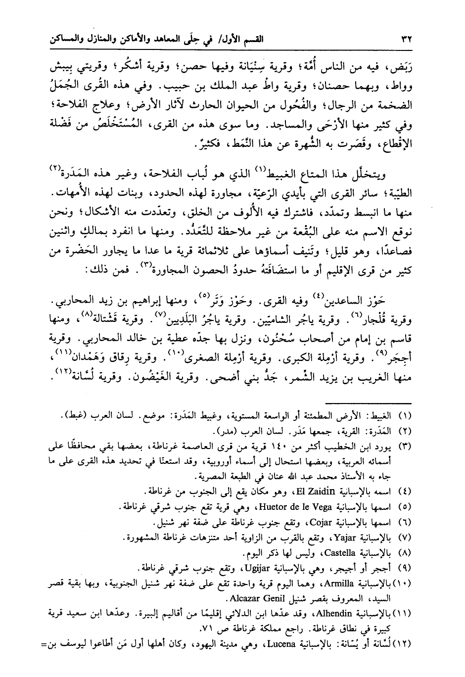 منها ما انبسط وتمدّد، فاشترك فيه الألوف من الخلق، وتعدّدت منه الأشكال؛ ونحن نوقع الاسم منه على البقعة من غير ملاحظة للتّعدّد. ومنها ما انفرد بمالك واثنين فصاعدا، وهو قليل؛ وتنيف أسماؤها على ثلاثمائة قرية ما عدا ما يجاور الحضرة من كثير من قرى الإقليم أو ما استضافته حدود الحصون المجاورة «3» . فمن ذلك: