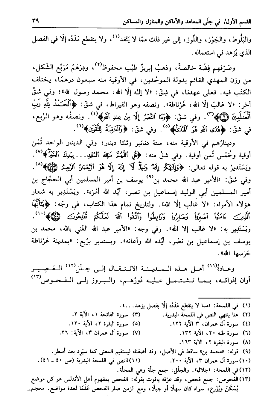 وصرفهم فضّة خالصة، وذهب إبريز طيّب محفوظ «2» ، ودرهم مربّع الشّكل، من وزن المهدي القائم بدولة الموحّدين، في الأوقية منه سبعون درهما، يختلف الكتب فيه. فعلى عهدنا، في شقّ: «لا إله إلّا الله، محمد رسول الله» ؛ وفي شقّ آخر: «لا غالب إلّا الله، غرناطة» . ونصفه وهو القيراط، في شقّ: الْحَمْدُ لِلَّهِ رَبِّ الْعالَمِينَ