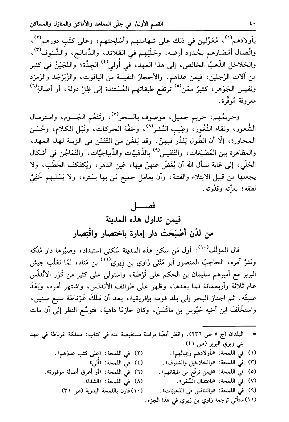قال المؤلّف «10» : أول من سكن هذه المدينة سكنى استبداد، وصيّرها دار ملكه ومقرّ أمره، الحاجب المنصور أبو مثنّى زاوي بن زيري «11» بن مناد، لمّا تغلّب جيش البربر مع أميرهم سليمان بن الحكم على قرطبة، واستولى على كثير من كور الأندلس عام ثلاثة وأربعمائة فما بعدها، وظهر على طوائف الأندلس، واشتهر أمره، وبعد صيته. ثم اجتاز البحر إلى بلد قومه بإفريقية، بعد أن ملك غرناطة سبع سنين، واستخلف ابن أخيه حبّوس بن ماكسن، وكان حازما داهية، فتوسّع النظر إلى أن مات