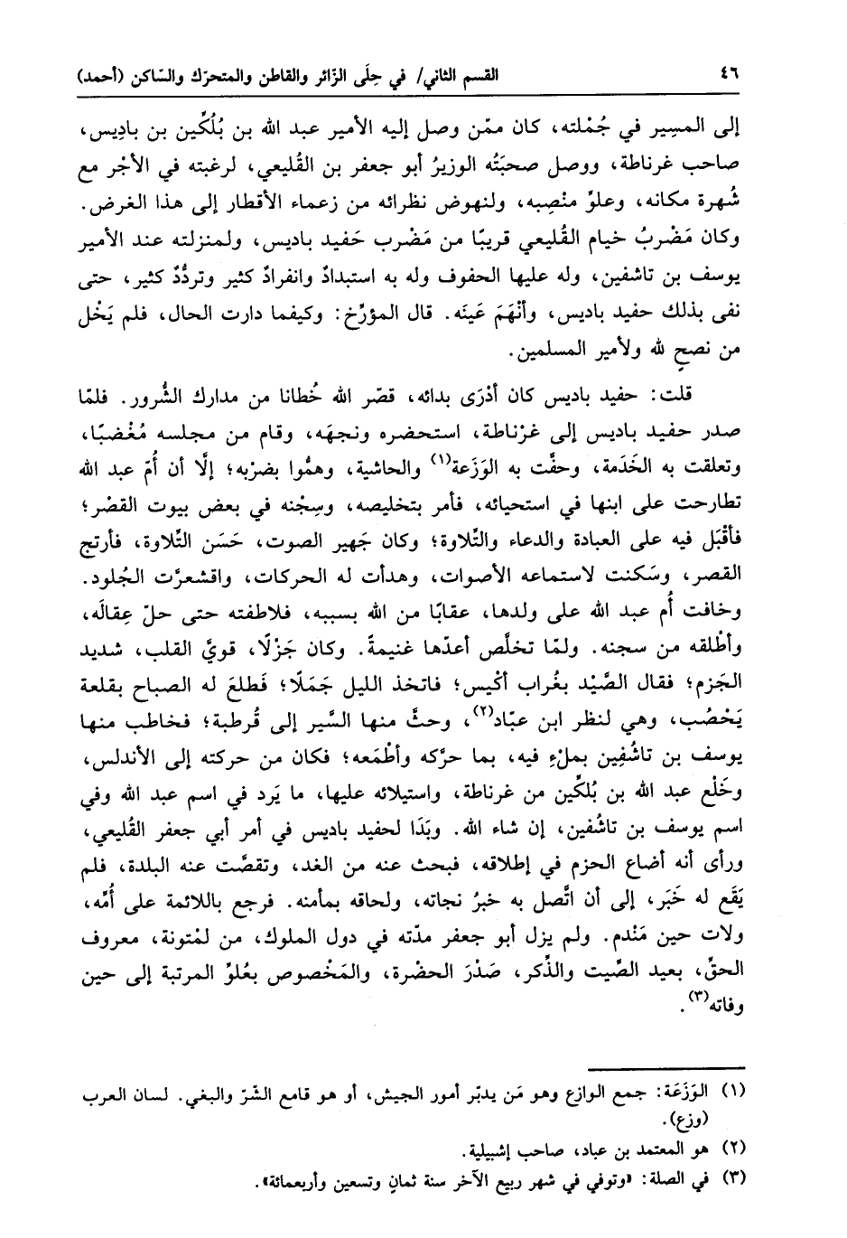 وخافت أم عبد الله على ولدها، عقابا من الله بسببه، فلاطفته حتى حلّ عقاله، وأطلقه من سجنه. ولمّا تخلّص أعدّها غنيمة. وكان جزلا، قويّ القلب، شديد الجزم؛ فقال الصّيد بغراب أكيس؛ فاتخذ الليل جملا؛ فطلع له الصباح بقلعة يحصب، وهي لنظر ابن عبّاد «2» ، وحثّ منها السّير إلى قرطبة؛ فخاطب منها يوسف بن تاشفين بملء فيه، بما حرّكه وأطمعه؛ فكان من حركته إلى الأندلس، وخلع عبد الله بن بلكّين من غرناطة، واستيلائه عليها، ما يرد في اسم عبد الله وفي اسم يوسف بن تاشفين، إن شاء الله. وبدا لحفيد باديس في أمر أبي جعفر القليعي، ورأى أنه أضاع الحزم في إطلاقه، فبحث عنه من الغد، وتقصّت عنه البلدة، فلم يقع له خبر، إلى أن اتّصل به خبر نجاته، ولحاقه بمأمنه. فرجع باللائمة على أمّه، ولات حين مندم. ولم يزل أبو جعفر مدّته في دول الملوك، من لمتونة، معروف الحقّ، بعيد الصّيت والذّكر، صدر الحضرة، والمخصوص بعلوّ المرتبة إلى حين وفاته «3» .