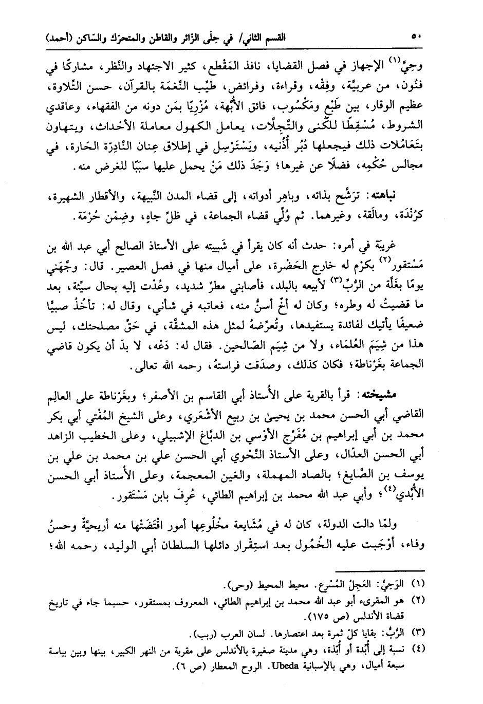 وحيّ «1» الإجهاز في فصل القضايا، نافذ المقطع، كثير الاجتهاد والنّظر، مشاركا في فنون، من عربيّة، وفقه، وقراءة، وفرائض، طيّب النّغمة بالقرآن، حسن التّلاوة، عظيم الوقار، بين طبع ومكسوب، فائق الأبّهة، مزريا بمن دونه من الفقهاء، وعاقدي الشروط، مسقطا للكنى والتّجلّات، يعامل الكهول معاملة الأحداث، ويتهاون بتعاملات ذلك فيجعلها دبر أذنيه، ويسترسل في إطلاق عنان النّادرة الحارة، في مجالس حكمه، فضلا عن غيرها؛ وجد ذلك من يحمل عليها سببا للغرض منه.