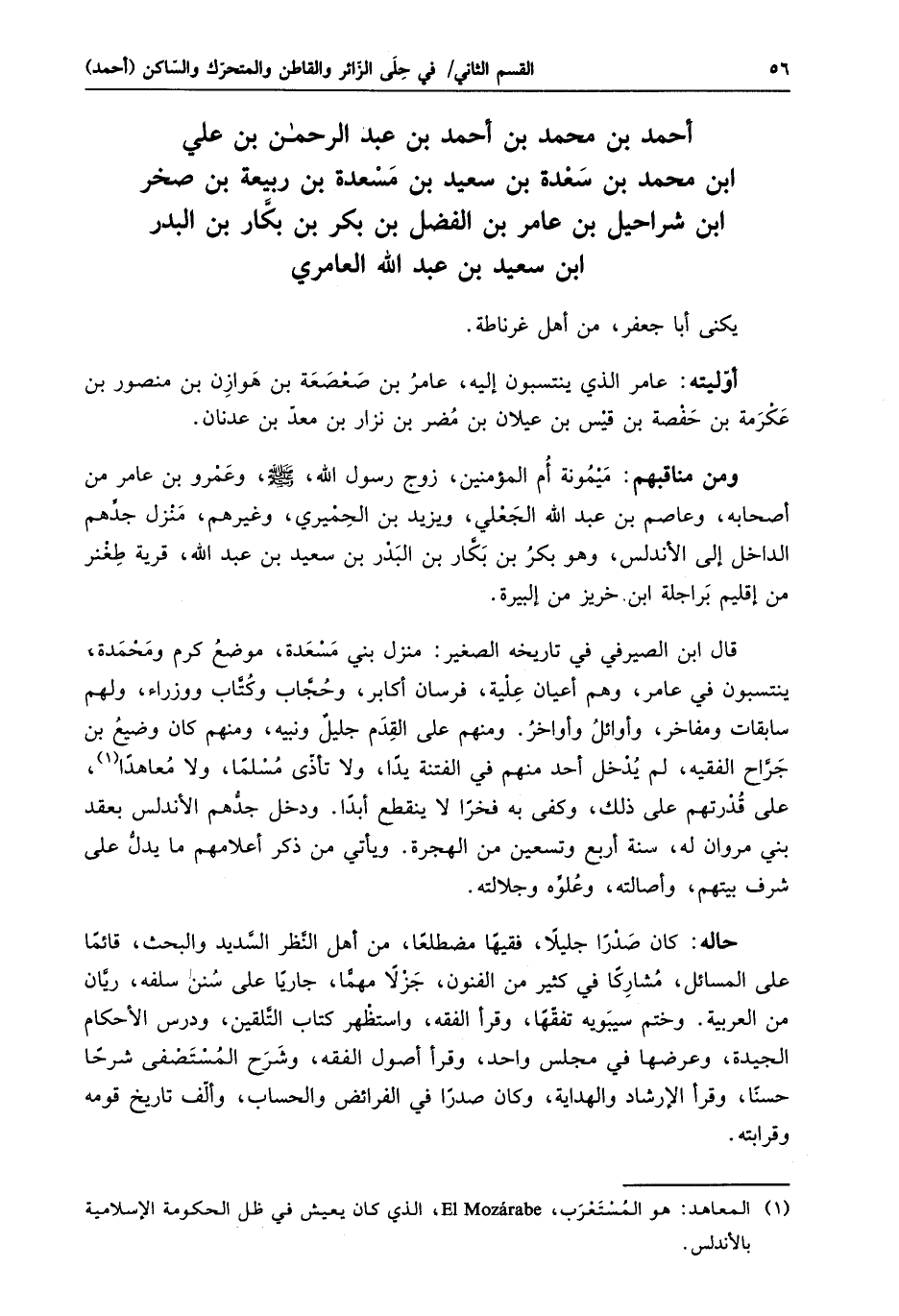 قال ابن الصيرفي في تاريخه الصغير: منزل بني مسعدة، موضع كرم ومحمدة، ينتسبون في عامر، وهم أعيان علية، فرسان أكابر، وحجّاب وكتّاب ووزراء، ولهم سابقات ومفاخر، وأوائل وأواخر. ومنهم على القدم جليل ونبيه، ومنهم كان وضيع بن جرّاح الفقيه، لم يدخل أحد منهم في الفتنة يدا، ولا تأذّى مسلما، ولا معاهدا «1» ، على قدرتهم على ذلك، وكفى به فخرا لا ينقطع أبدا. ودخل جدّهم الأندلس بعقد بني مروان له، سنة أربع وتسعين من الهجرة. ويأتي من ذكر أعلامهم ما يدلّ على شرف بيتهم، وأصالته، وعلوّه وجلالته.