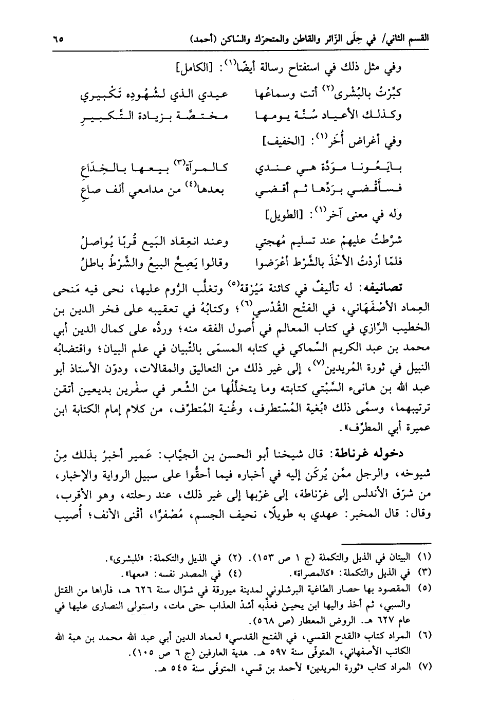 تصانيفه: له تأليف في كائنة ميرقة «7» وتغلّب الرّوم عليها، نحى فيه منحى العماد الأصفهاني، في الفتح القدسي «8» ؛ وكتابه في تعقيبه على فخر الدين بن الخطيب الرّازي في كتاب المعالم في أصول الفقه منه؛ وردّه على كمال الدين أبي محمد بن عبد الكريم السّماكي في كتابه المسمّى بالتّبيان في علم البيان؛ واقتضابه النبيل في ثورة المريدين «9» ، إلى غير ذلك من التعاليق والمقالات، ودوّن الأستاذ أبو عبد الله بن هانىء السّبتي كتابته وما يتخلّلها من الشّعر في سفرين بديعين أتقن ترتيبهما، وسمّى ذلك «بغية المستطرف، وغنية المتطرّف، من كلام إمام الكتابة ابن عميرة أبي المطرّف» .