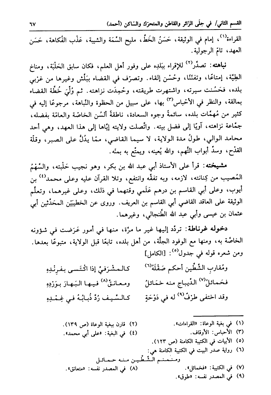 نباهته: تصدّر «2» للإقراء ببلده على وفور أهل العلم، فكان سابق الحلبة، ومناخ الطيّة، إمتاعا، وتفنّنا، وحسن إلقاء. وتصرّف في القضاء ببلّش وغيرها من غربي بلده، فحسنت سيرته، واشتهرت طريقته، وحمدت نزاهته. ثم ولّي خطّة القضاء بمالقة، والنظر في الأحباس «3» بها، على سبيل من الحظوة والنّباهة، مرجوعا إليه في كثير من مهمّات بلده، سائمة وجوه السعادة، ناطقة ألسن الخاصّة والعامّة بفضله، جمّاعة نزاهته، آويا إلى فضل بيته. واتّصلت ولايته إيّاها إلى هذا العهد، وهي أحد محامد الوالي، طول مدة الولاية، لا سيما القاضي، ممّا يدلّ على الصبر، وقلّة القدح، وسدّ أبواب التّهم، والله يعينه، ويمتّع به بمنّه.