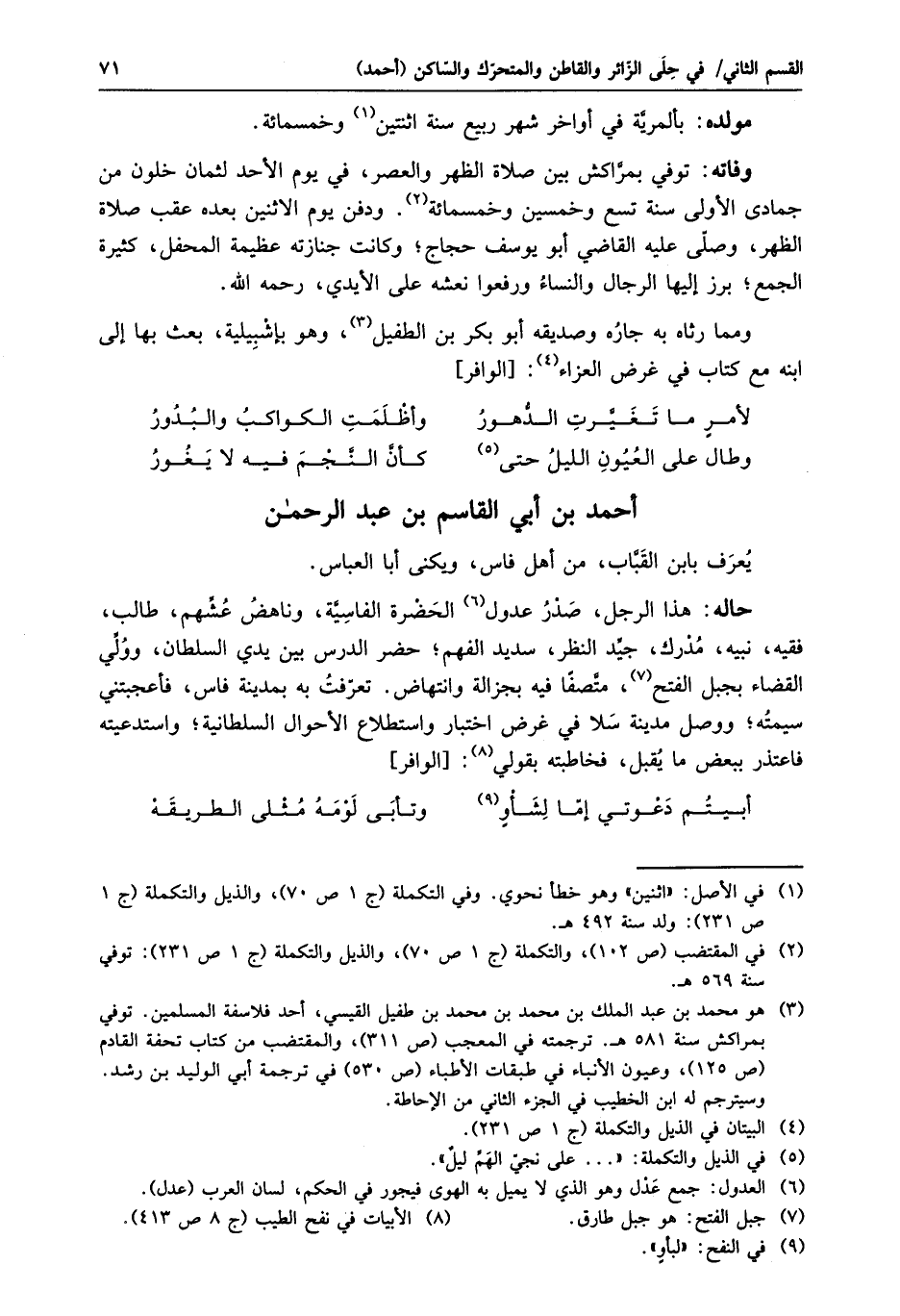 حاله: هذا الرجل، صدر عدول «6» الحضرة الفاسيّة، وناهض عشّهم، طالب، فقيه، نبيه، مدرك، جيّد النظر، سديد الفهم؛ حضر الدرس بين يدي السلطان، وولّي القضاء بجبل الفتح «7» ، متّصفا فيه بجزالة وانتهاض. تعرّفت به بمدينة فاس، فأعجبتني سيمته؛ ووصل مدينة سلا في غرض اختبار واستطلاع الأحوال السلطانية؛ واستدعيته فاعتذر ببعض ما يقبل، فخاطبته بقولي «8» : [الوافر]