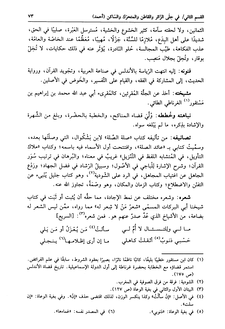شعره: وشعره مختلف عن نمط الإجادة، مما حقّه أن يثبت أو ثبت في كتاب شيخنا أبي البركات المسمّى «شعر من لا شعر له» مما رواه، ممّن ليس الشعر له بضاعة، من الأشياخ الذي عدّ صدر عنهم هو. فمن شعره «3» : [السريع]