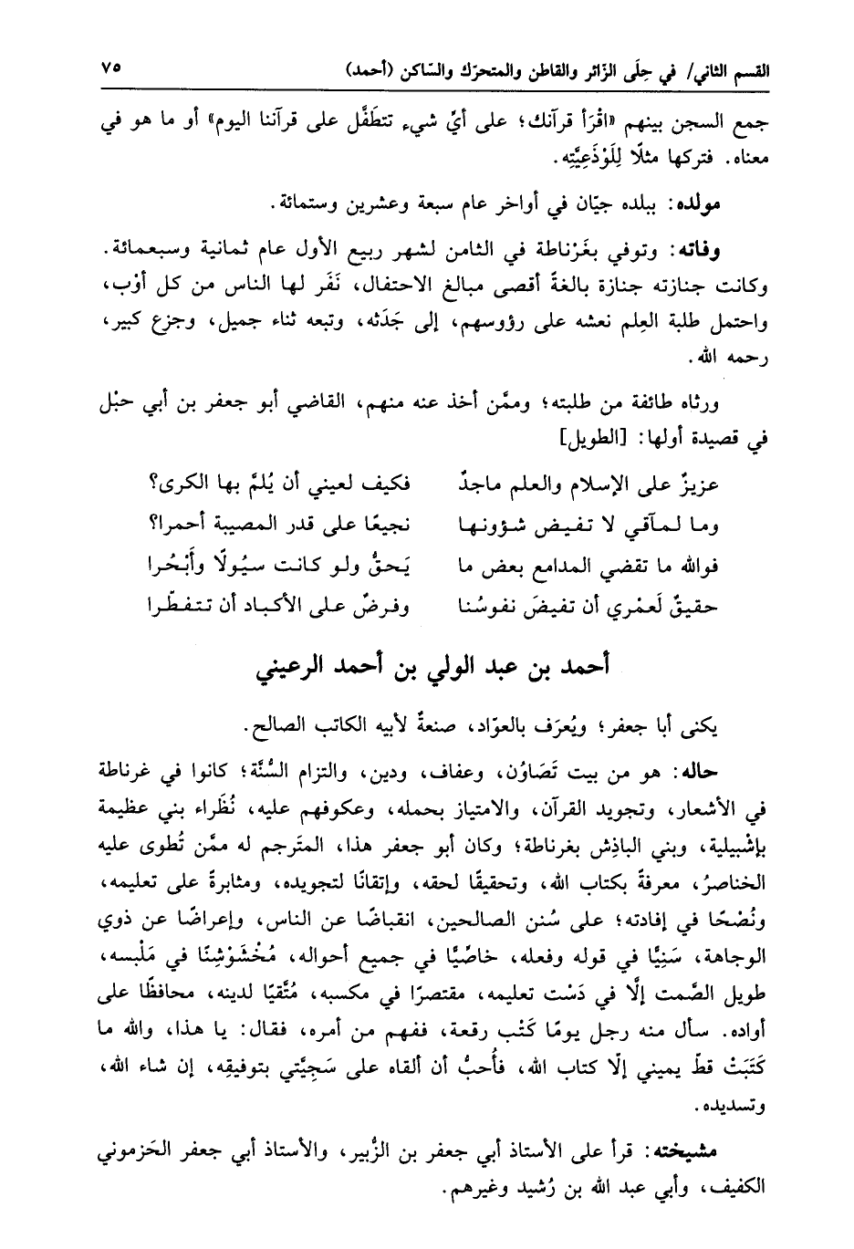 حاله: هو من بيت تصاون، وعفاف، ودين، والتزام السّنّة؛ كانوا في غرناطة في الأشعار، وتجويد القرآن، والامتياز بحمله، وعكوفهم عليه، نظراء بني عظيمة بإشبيلية، وبني الباذش بغرناطة؛ وكان أبو جعفر هذا، المترجم له ممّن تطوى عليه الخناصر، معرفة بكتاب الله، وتحقيقا لحقه، وإتقانا لتجويده، ومثابرة على تعليمه، ونصحا في إفادته؛ على سنن الصالحين، انقباضا عن الناس، وإعراضا عن ذوي الوجاهة، سنيّا في قوله وفعله، خاصّيّا في جميع أحواله، مخشوشنا في ملبسه، طويل الصّمت إلّا في دست تعليمه، مقتصرا في مكسبه، متّقيا لدينه، محافظا على أواده. سأل منه رجل يوما كتب رقعة، ففهم من أمره، فقال: يا هذا، والله ما كتبت قطّ يميني إلّا كتاب الله، فأحبّ أن ألقاه على سجيّتي بتوفيقه، إن شاء الله، وتسديده.
