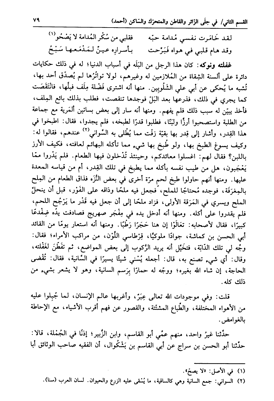 غفلته ونوكه: كان هذا الرجل من البله في أسباب الدنيا؛ له في ذلك حكايات دائرة على ألسنة الشقاة من الملازمين له وغيرهم، لولا تواترها لم يصدّق أحد بها، تشبه ما يحكى عن أبي علي الشلوبين. منها أنه اشترى فضلة ملف فبلّها، فانتقصت كما يجري في ذلك، فذرعها بعد البلّ فوجدها تنقصت، فطلب بذلك بائع الملف، فأخذ يبيّن له سبب ذلك فلم يفهم. ومنها أنه سار إلى بعض بساتين ألمرية مع جماعة من الطلبة واستصحبوا أرزّا ولبنا، فطلبوا قدرا لطبخه، فلم يجدوا، فقال: اطبخوا في هذا القدر، وأشار إلى قدر بها بقيّة زفت مما يطلى به السّواني «2» عندهم، فقالوا له: