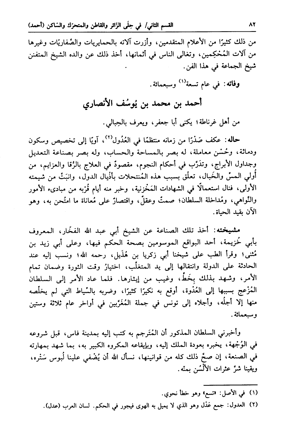 حاله: عكف صدرا من زمانه منتظما في العدول «2» ، آويا إلى تخصيص وسكون ودماثة، وحسن معاملة، له بصر بالمساحة والحساب، وله بصر بصناعة التعديل وجداول الأبراج، وتدرّب في أحكام النجوم، مقصود في العلاج بالرّقا والعزائم، من أولي المسّ والخبال، تعلّق بسبب هذه المنتحلات بأذيال الدول، وانبتّ من شيمته الأولى، فنال استعمالا في الشهادات المخزنية، وخبر منه أيام قربه من مبادئ الأمور والنّواهي، ومداخلة السلطان؛ صمت وعقل، واقتصار على معاناة ما امتحن به، وهو الآن بقيد الحياة.