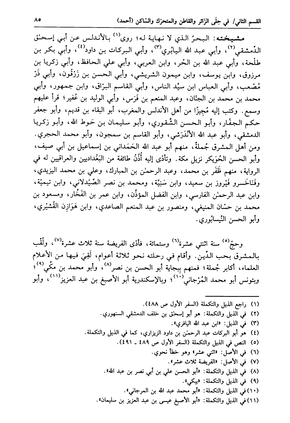 وحجّ «5» سنة اثنتي عشرة «6» وستمائة، فأدّى الفريضة سنة ثلاث عشرة «7» ، ولقّب بالمشرق بحب الدّين. وأقام في رحلته نحو ثلاثة أعوام، لقي فيها من الأعلام العلماء، أكابر جملة؛ فمنهم ببجاية أبو الحسن بن نصر «8» ، وأبو محمد بن مكّي «9» ؛ وبتونس أبو محمد المرجاني «10» ؛ وبالإسكندرية أبو الأصبغ بن عبد العزيز «11» ، وأبو