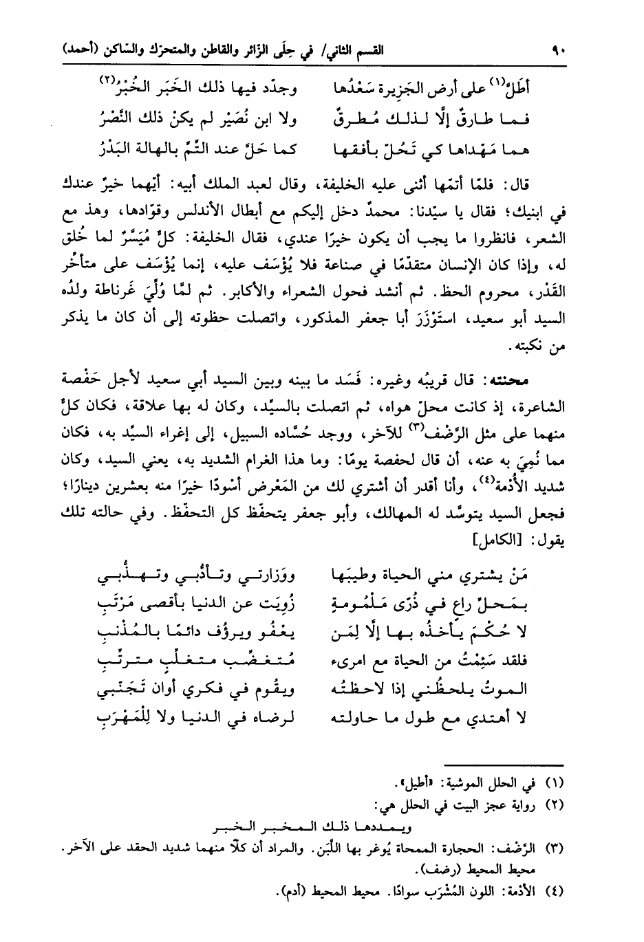 محنته: قال قريبه وغيره: فسد ما ببنه وبين السيد أبي سعيد لأجل حفصة الشاعرة، إذ كانت محلّ هواه، ثم اتصلت بالسيّد، وكان له بها علاقة، فكان كلّ منهما على مثل الرّضف «3» للآخر، ووجد حسّاده السبيل، إلى إغراء السيّد به، فكان مما نمي به عنه، أن قال لحفصة يوما: وما هذا الغرام الشديد به، يعني السيد، وكان شديد الأدمة «4» ، وأنا أقدر أن أشتري لك من المعرض أسودا خيرا منه بعشرين دينارا؛ فجعل السيد يتوسّد له المهالك، وأبو جعفر يتحفّظ كل التحفّظ. وفي حالته تلك يقول: [الكامل]